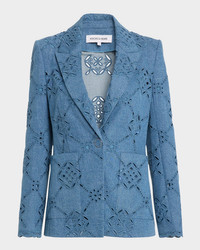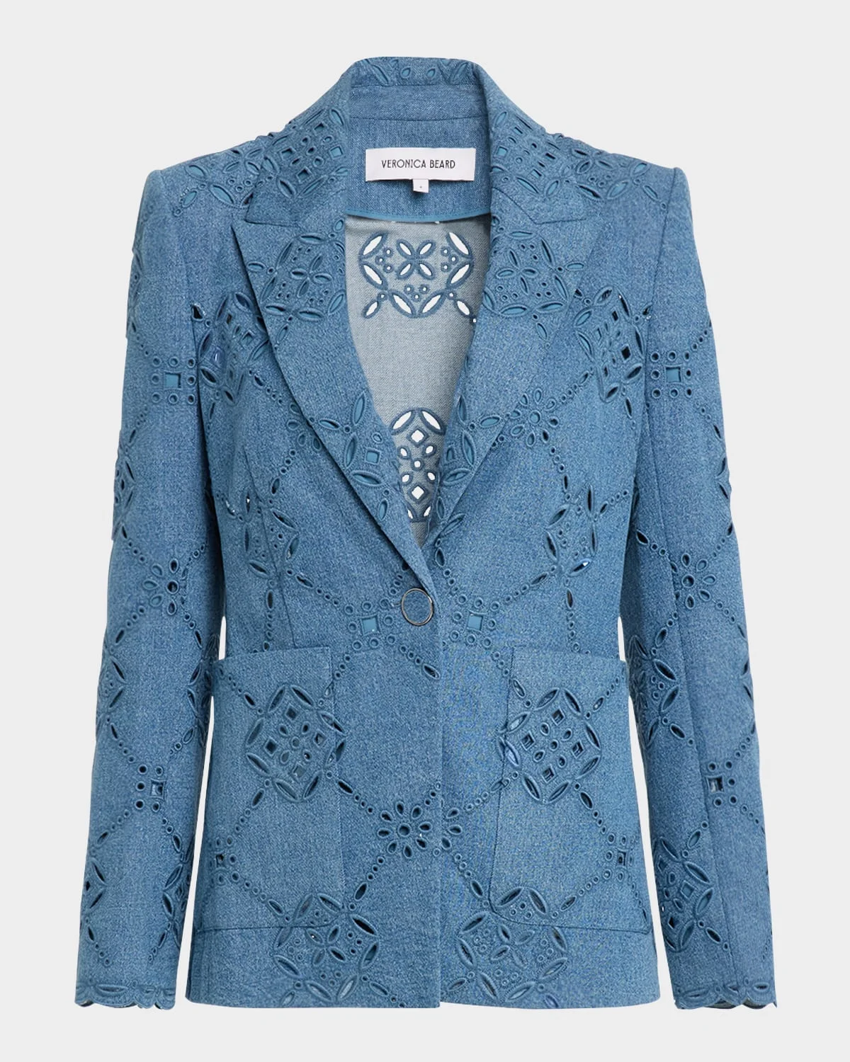 - Veronica Beard "Naira" denim jacket with eyelet embroidery - Peak lapel; single-button front - Long sleeves - Scalloped cuffs - Front patch pockets - Tailored fit - Cotton - Dry clean - Imported
