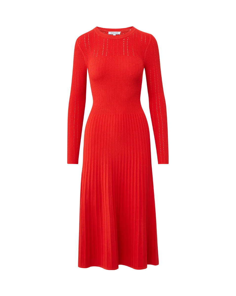 Product details The ease of a sweater dress in a fit-and-flare silhouette. Spun from an exceptionally soft stretch knit, the long-sleeve Nami features a body-hugging bodice and ribbing down the skirt to mimic pleats. Wear alone now and, as the temperature drops, as a foundation piece to layer on jackets and oversized sweaters. - 83% Viscose, 17% Polyester - Dry clean only - Style #2411KS1290219