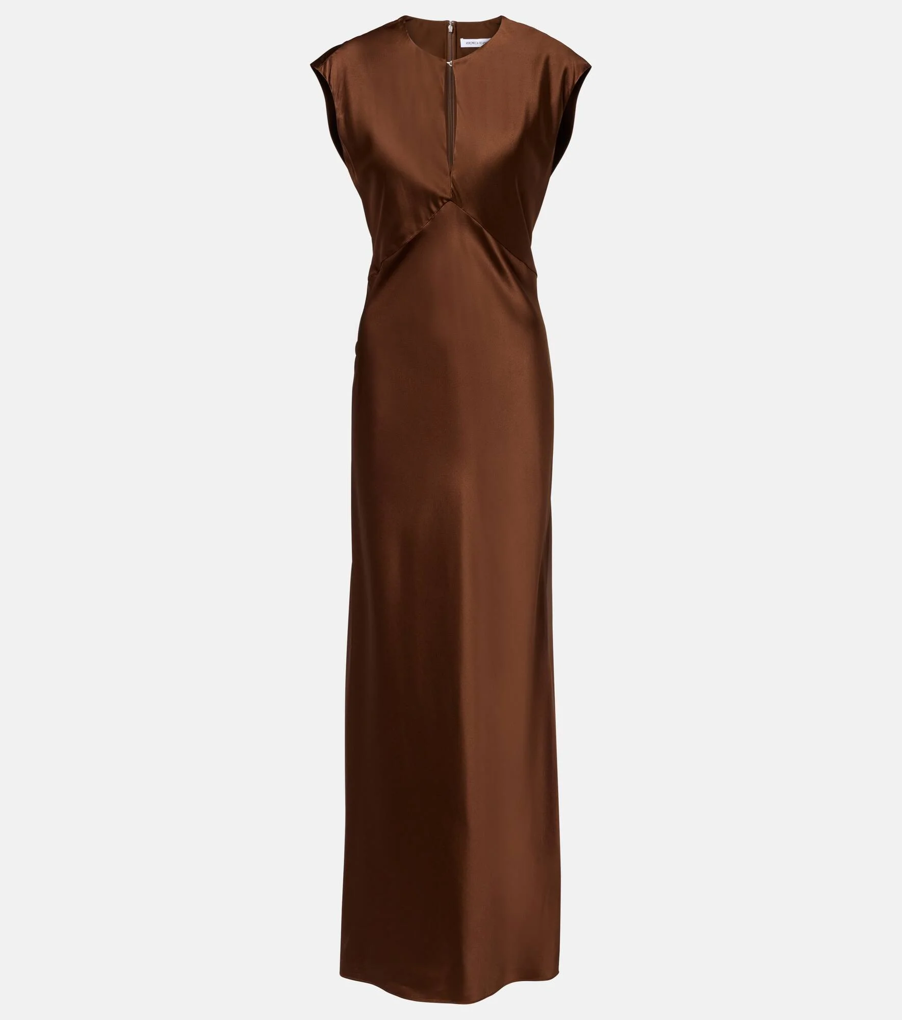 Make an impression during special events in the Nelzy maxi dress from Veronica Beard. Made from lustorus silk-blend satin, the style is complete with a front cutout for a subtle yet captivating finish. Product Details - Material: 53% silk, 35% viscose, 12% elastane - Care instructions: dry clean - Made in China - Color: brown - Designer color name: Walnut - Item color: brown - Lining: 100% polyester - Closure: invisible zipper, hook-fastening front - Item number: P01142617 Size & Fit - True to size - Cinched waist - Non-stretchy fabric - The model seen in the picture is 178cm-5'10" and wearing a size US 4