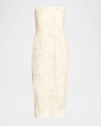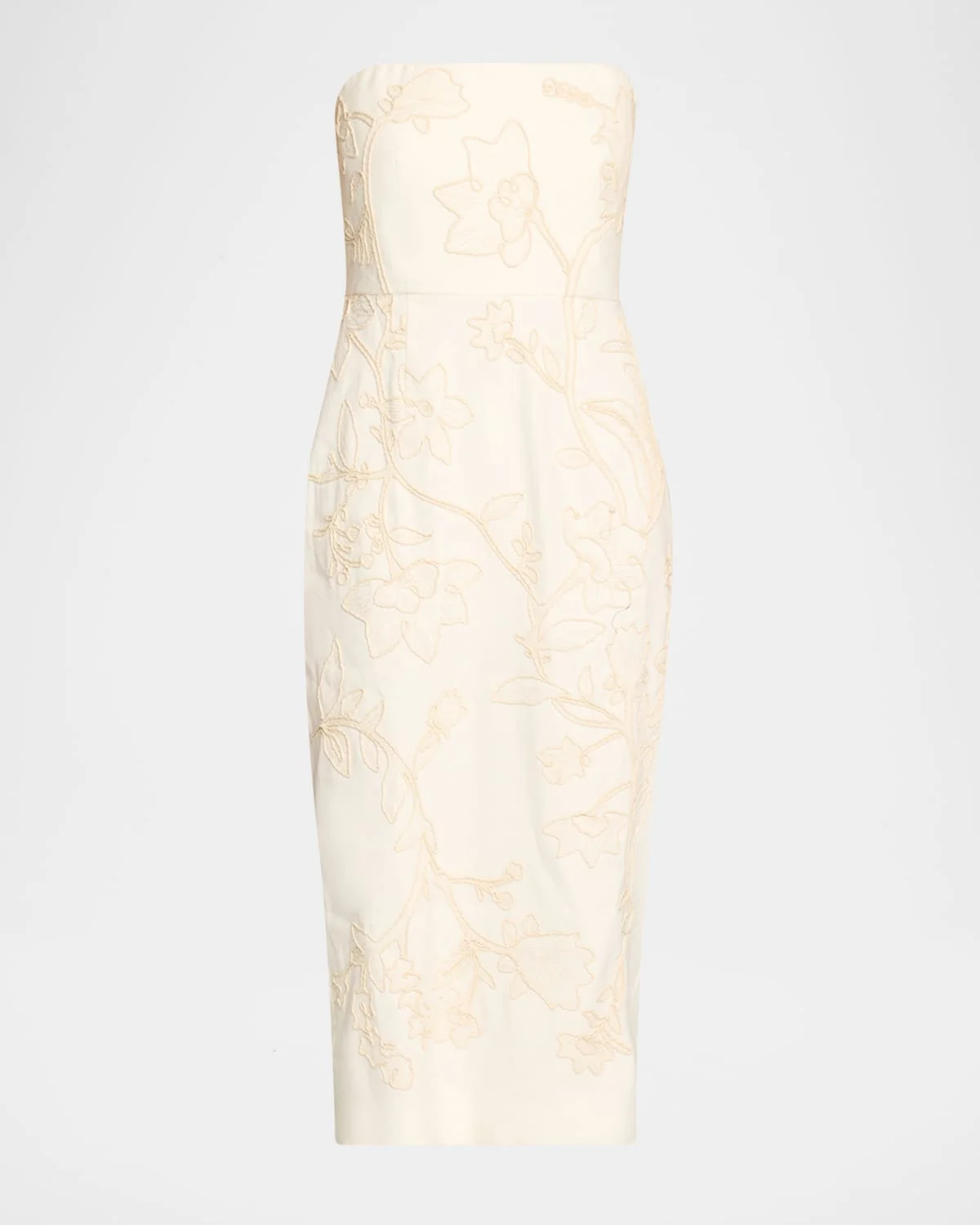 - Veronica Beard "Netia" floral embroidered midi dress - Strapless neckline - Sleeveless - Sheath silhouette - Center back vent - Invisible back zip - Ramie - Dry clean - Imported