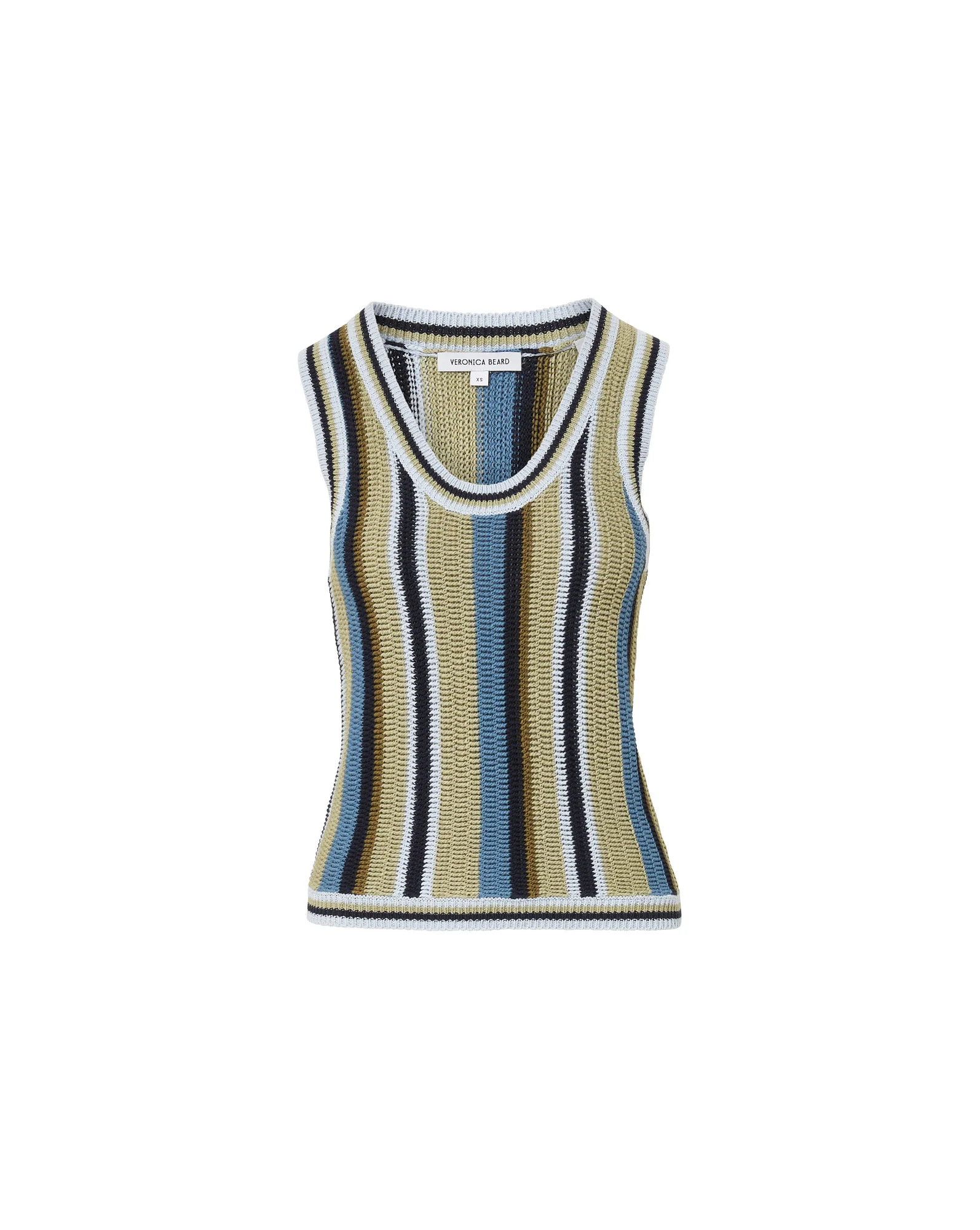 Product details Your go-to for relaxed days and summer getaways. Spun from a premium stretch cotton, the Neveah tank top features a relaxed fit, wide straps, a deep scoop neck, and chic stripes in earthy blues and greens. Pair with shorts and jeans, sneakers and sandals. Bonus: the lightweight, breathable fabrication is a great layering piece for beach days, too. - 75% Cotton, 25% Polyamide - Dry clean only - Style #2506KC2690639