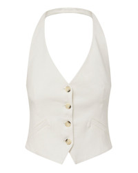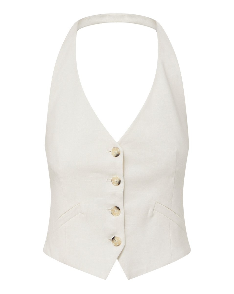 A chic halter-neck puts a decidedly feminine spin on the menswear-inspired Arabella. Expertly tailored in premium stretch linen from France, the vest boasts an adjustable back tab for the perfect custom fit. Tortoiseshell buttons and welt pockets complete the look. Wear as a layering piece or style with the coordinating Franzi short or Sofia Pant for a youthful take on the statement set. DETAILS & FIT - 55% Linen, 43% Viscose, 2% Elastane - Lining: 96% Polyester, 4% Spandex - Length 19.75”, based on a size 2 - Our model is 5'10" and is wearing a size 2 - Fabric country of origin: France - Professional dry-clean only - Style #2403LN00210678