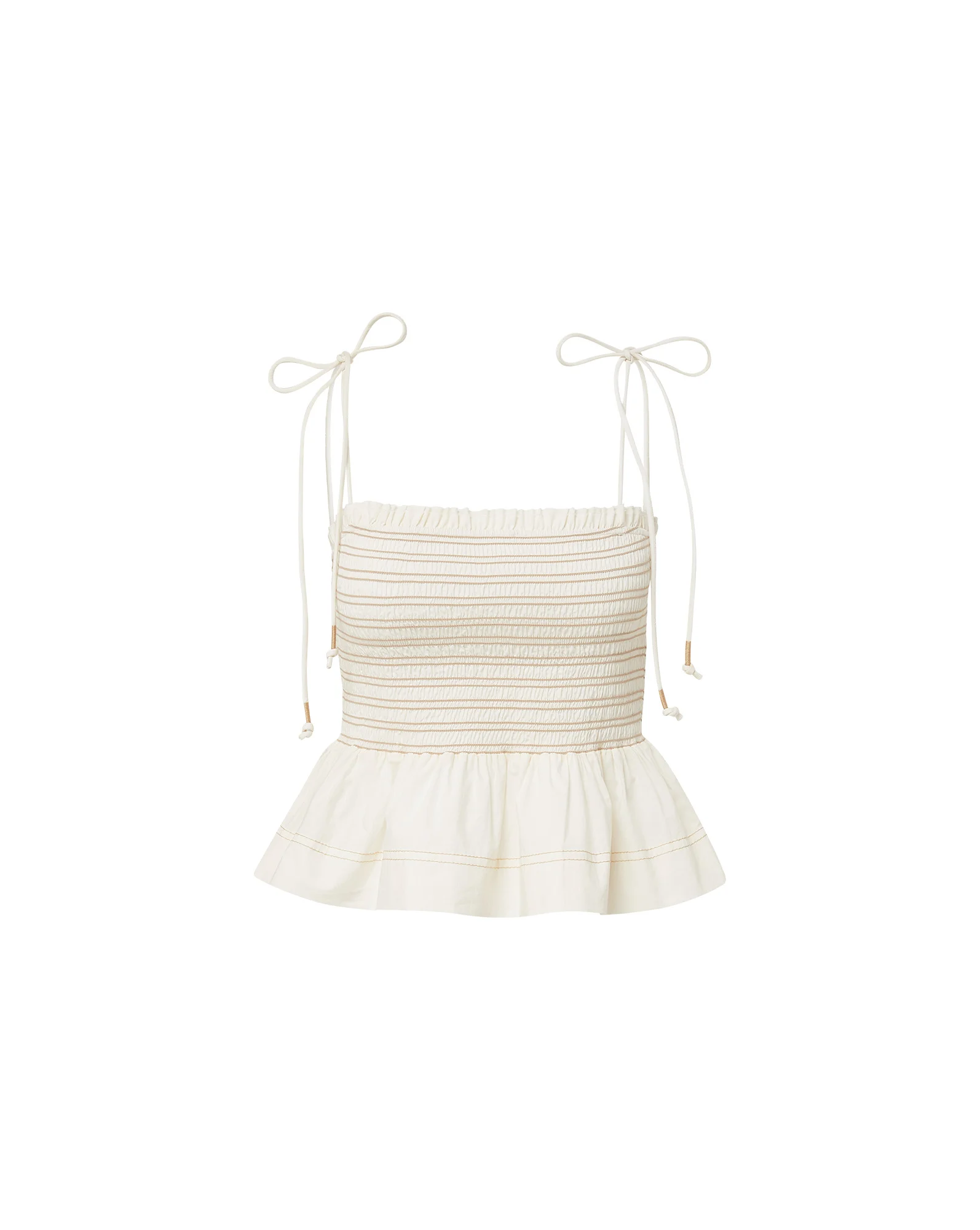 Product details Summer, in a top. Crafted from 100% cotton, the Ophelia tank top is the ultimate in feminine ease. Available in white, it boasts delicate allover smocking, a ruffled trim, and a flounced hem. Contrast-color stripes add graphic intrigue while trailing self-tie straps—capped with gold aglets—furthers the romantic feel. Pair with wide-leg jeans or capris for warm-weather chic. - 100% Cotton - Unlined - Dry clean only - Style #2506CO18241183