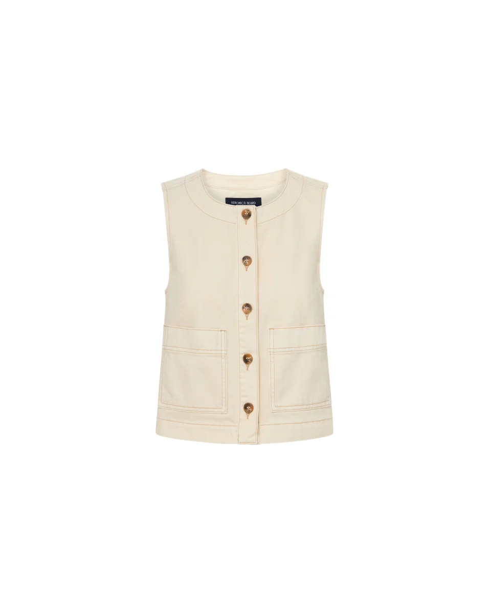Product details An elevated take on the denim vest—in a chic, off-white wash for spring. Ording's streamlined, collarless design is cut for a relaxed fit with darting at the bust for a flattering shape. Two oversized front patch pockets, contrast stitching, and tortoiseshell buttons complete the look. Pair with matching ecru jeans for a double-denim moment, or style with an airy linen skirt for laid-back polish. - Details: 100% Cotton - Turn inside out and machine wash cold. Hang to dry. - Style #J2504D140001EC