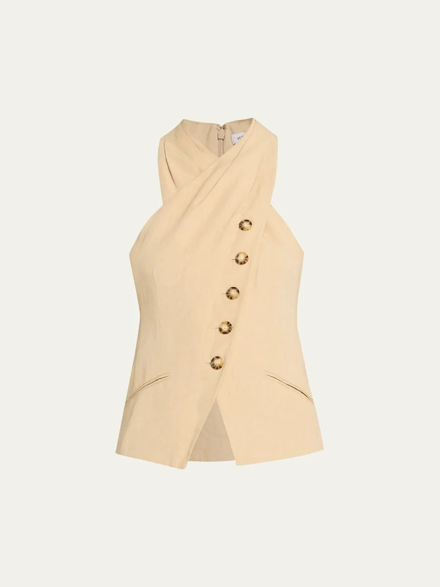 Finished with an asymmetric buttonfront, the "Pacey" vest by Veronica Beard is tailored in a lightweight linenblend and boasts a crisscross halter neckline for a refined silhouette. Sleeveless Angled welt pockets Tailored fit Cutaway hem Center back zip Lyocell/linen Dry clean Imported SIZE amp; FITModel measurements: 5'10" tall Model is wearing a US size 4/Small