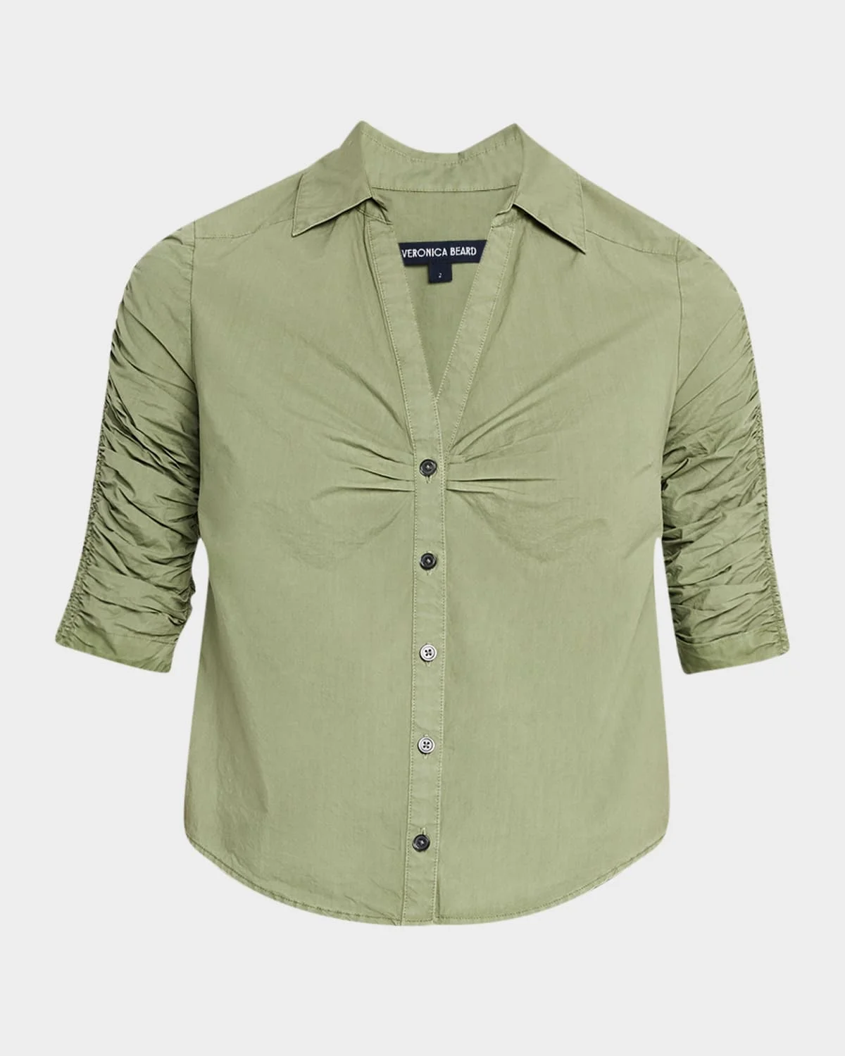 Veronica Beard "Porta" cotton shirt featuring elbowlength ruched sleeves Point collar; V neckline Classic fit Rounded hem Buttonfront Cotton Unlined Dry clean Imported