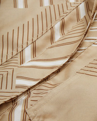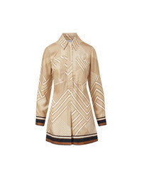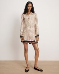 Product details A versatile mini to wear now—and later. Crafted from a premium silk blend with a bold geometric pattern, Pryce is a relaxed, long-sleeve mini dress with a subtle A-line silhouette and front pleating. A collared hidden button placket, oversized front patch pockets, and striped hems complete the look. Pair with sandals for summer ease; layer over pants or tights once temperatures start to drop. - 53% Silk, 47% Viscose - Lining: 100% Polyester - Dry clean only - Style #2507FL3721718