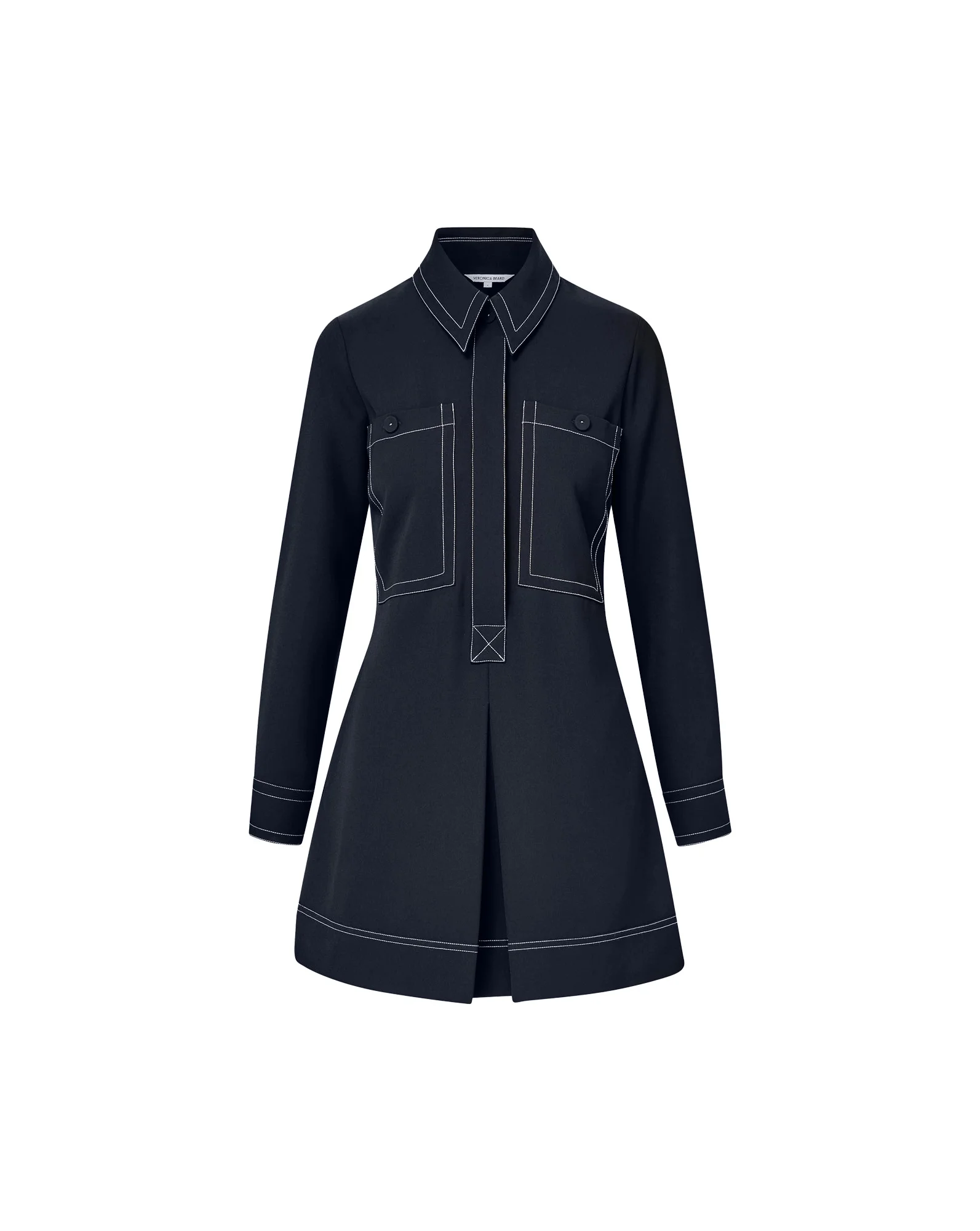 Product details A versatile mini to wear now—and later. Crafted from premium stretch crepe in navy, Pryce is a relaxed, long-sleeve mini dress with a subtle A-line silhouette and front pleating. A collared hidden button placket, oversized front patch pockets, and contrast stitching complete the look. Pair with sandals for summer ease; layer over tights and boots once temperatures begin to drop. - 97% Cotton, 3% Elastane - Unlined - Dry clean only - Style #2507CP3221718