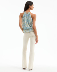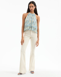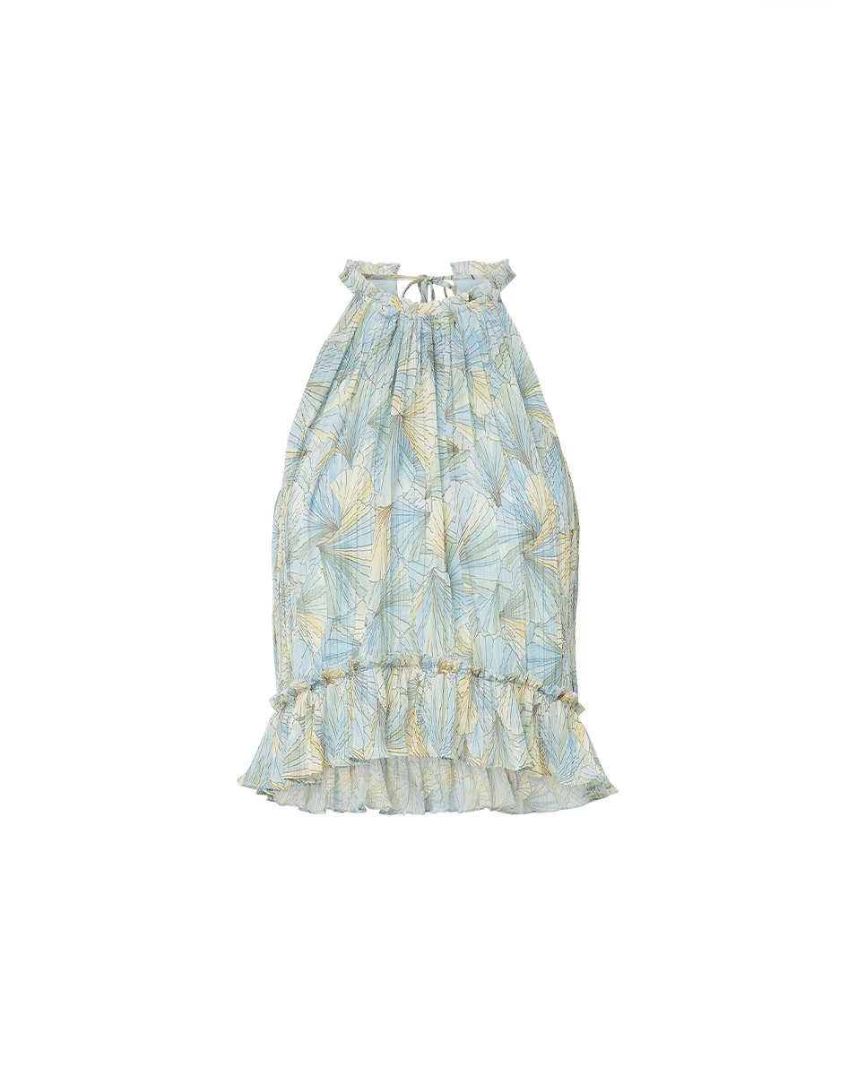 Product details A going-out top that's equal parts ease and romance. Made from a premium stretch fabrication, the Renee halter top is defined by allover pleating and a custom painted shell pattern in pale blue and yellow. Cut for a breezy, relaxed fit, it features a gathered neckline, a ruffled flounce, and an adjustable drawstring at the back, finished with a faux baroque pearl. Lightweight and airy, it's a statement summer look for both day and night. - 100% Polyester - Lining: 100% Polyester - Dry clean only - Style #2505CF1440795