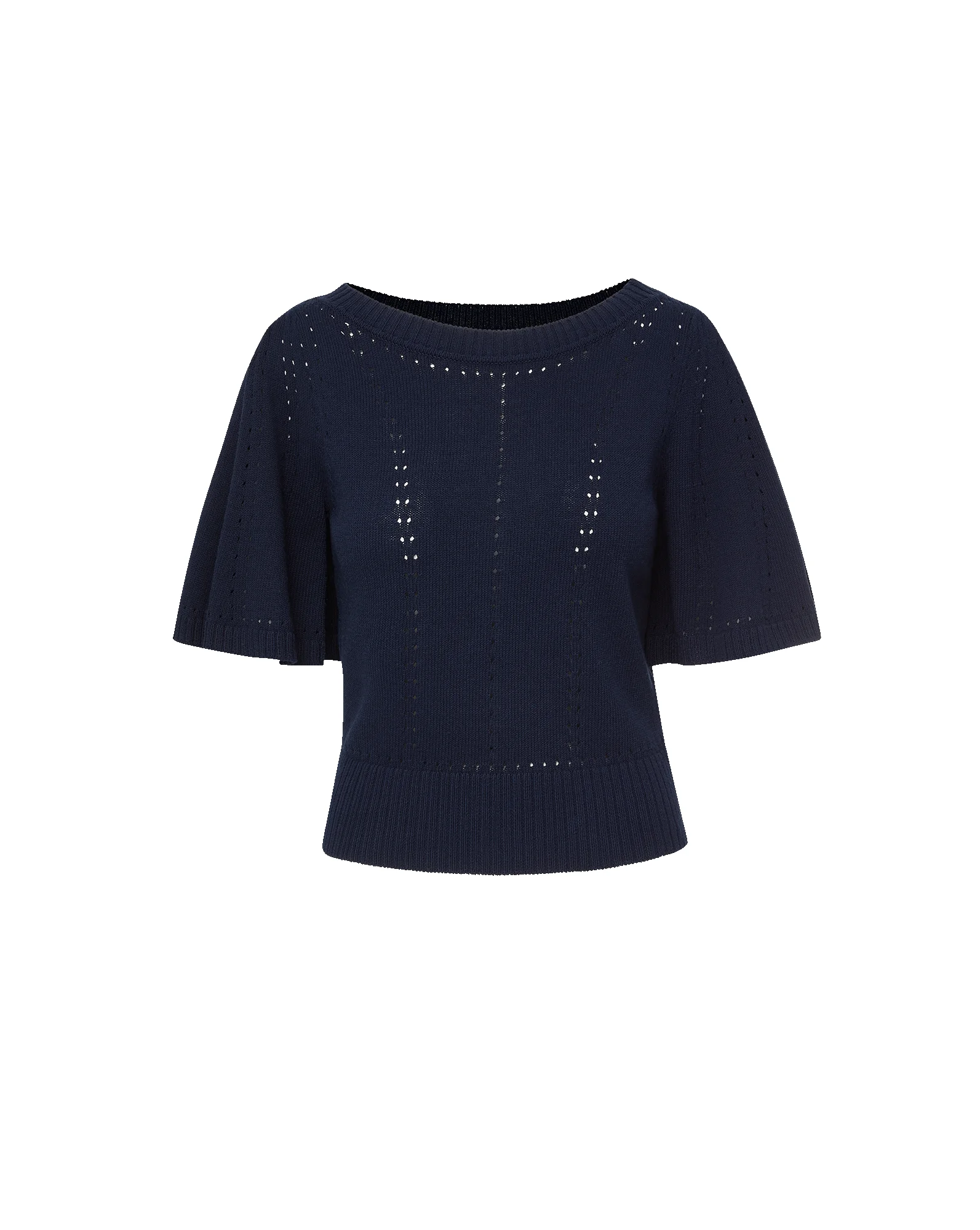 Product details Designed with delicate pointelle detailing and softly draped, quarter-length flutter sleeves, the Rhennan knit top is a study in timeless polish. Crafted from premium cotton in navy, it boasts an incredibly soft, crepe-like feel. An ultra-wide ribbed hem creates subtle structure and a more fitted silhouette, while ribbed trim at the neckline and sleeves completes the look. Pair it with dark-wash denim for a refined, effortless look. - 100% Cotton - Dry clean only - Style #2603KC6591126