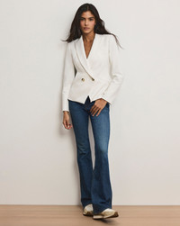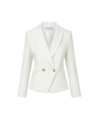 Product details A modern update to a tailored classic. Expertly crafted in the USA from premium stretch suiting, the off-white Rickie dickey jacket features a cropped silhouette and a double-breasted closure that subtly defines the waist when fastened. Finished with a peak lapel, angled welt pockets, and horn buttons, it's the perfect balance of polish and ease. Style it with a white pants for a matching-set moment—then add a dickey to switch up your look. - 63% Polyester, 27% Viscose, 7% Cotton, 3% Elastane - Lining: 100% Viscose - Made in USA - Dry clean only, except with trichloroethylene. Do not bleach. Medium iron. - Style #2602SU00211010