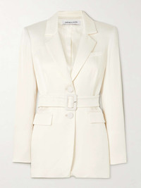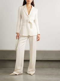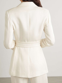 EDITORS'NOTES Veronica Beard's Spring '25 collection is all about effortless elegance. This 'Ryanne' blazer is tailored from fluid crepe for a slightly loose fit and has a belted waist. Team it with the coordinating pants and tonal heels. SIZE & FIT Model measurements: - Fits true to size, take your normal size - Designed for a slightly loose fit, use the belt to cinch in at the waist - Internal shoulder pads - Mid-weight, non-stretchy fabric - Model is 177cm/ 5'10" and is wearing a US 4 - Bust: 81cm/ 32" - Waist: 68cm/ 27" - Hip: 94cm/ 37" DETAILS & CARE - White crepe - Button fastenings through front - 72% acetate, 28% polyester - Dry clean - Designer color: Dove