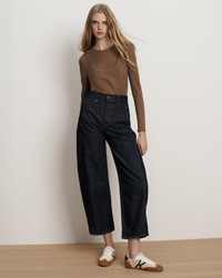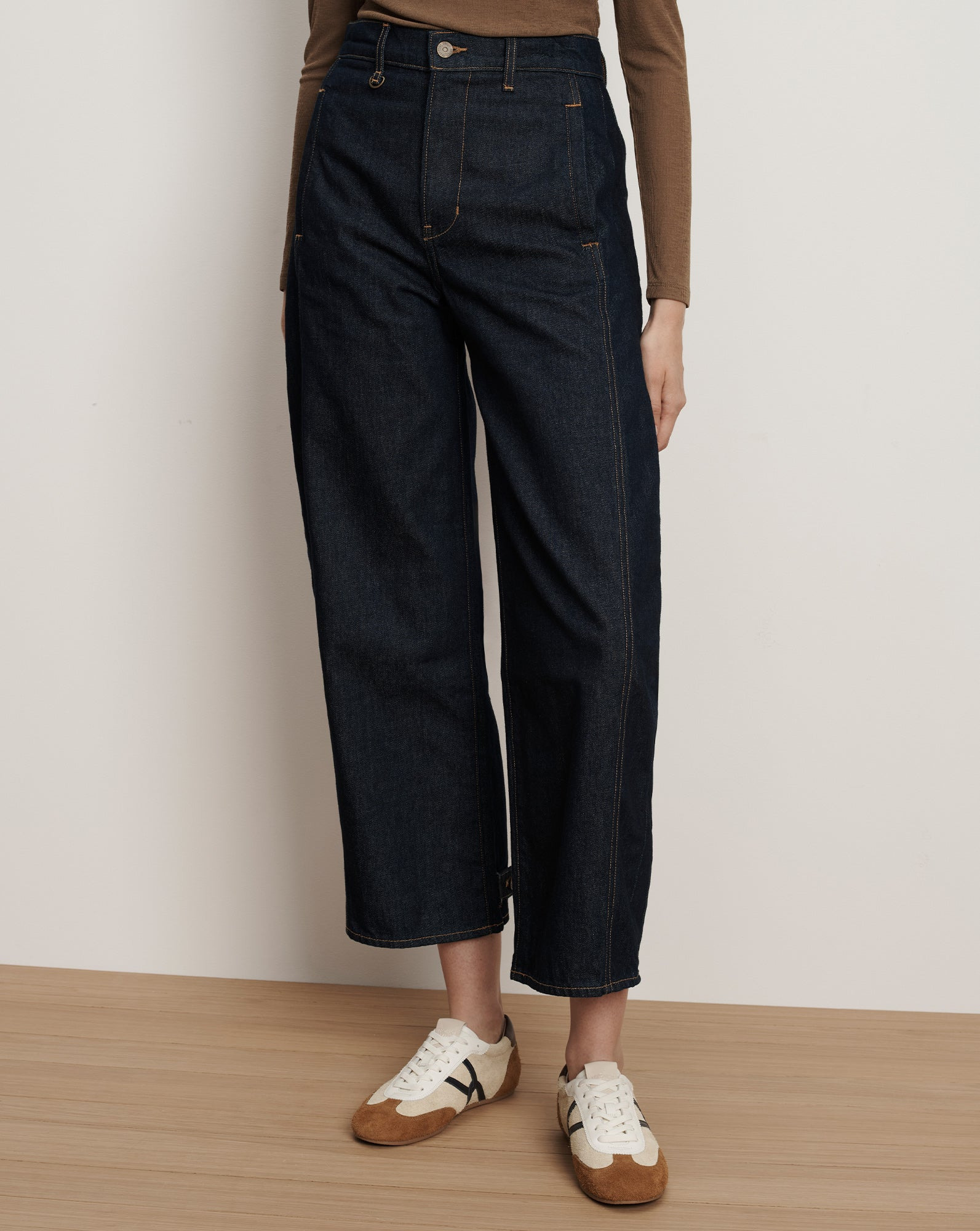 Product details The Ryder you know and love—now updated with button detailing at the waist and hem. Made in LA from non-stretch Japanese denim, this high-rise barrel jean features a relaxed silhouette that’s cut wide through the hips and thighs. Adjustable buttons at the hem allow you to wear them straight or cinched for a more balloon-shaped effect. Finished with back flap pockets, this VB favorite takes on a modern, utilitarian edge. Pairs effortlessly with both flats and heels. - 100% Cotton - Made in LA from premium Japanese denim - Turn inside out and machine wash cold. Hang to dry. - Style #J25091680093ID