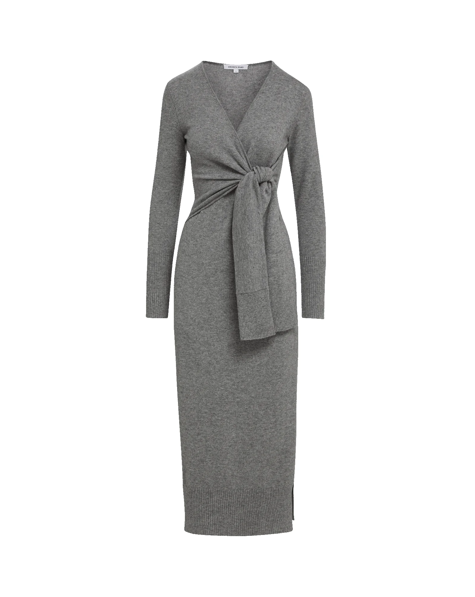 Product details The sweater dress—perfected. Spun from a premium merino-wool-and-cashmere blend in grey, the Salomez features long sleeves and a V-neckline that falls into a wrap detail, evoking the look of a tied sweater at the waist. Ribbed trims and subtle side slits complete the look, while its midi length makes it a versatile piece to dress up or down. Style with tall boots, ballet flats, or heels alike. - 70% Merino Wool, 30% Cashmere - Dry clean only - Style #2511KA4421988
