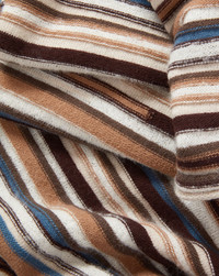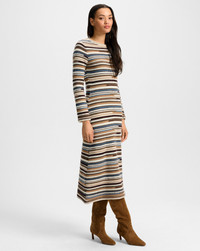 Product details The essential sweater dress with flattering, feminine shape. The Sanders is spun from an Italian wool-cashmere blend for a soft, luxurious feel—perfect for cooler months. Designed to softly hug the body, it’s fitted throughout the bodice before falling to a relaxed, A-line skirt. Knit with a horizontal stripe pattern in a variety of brown, blue, and white tones, it’s finished with a classic crewneck and a braided rolled trim for an elevated touch. Pair with tall boots or ballet flats for an effortless look. - 75% Wool, 8% Cashmere, 6% Mohair, 6% Alpaca, 5% Polyamide - Fabric country of origin: Italy - Dry clean only - Style #2509KA5021768