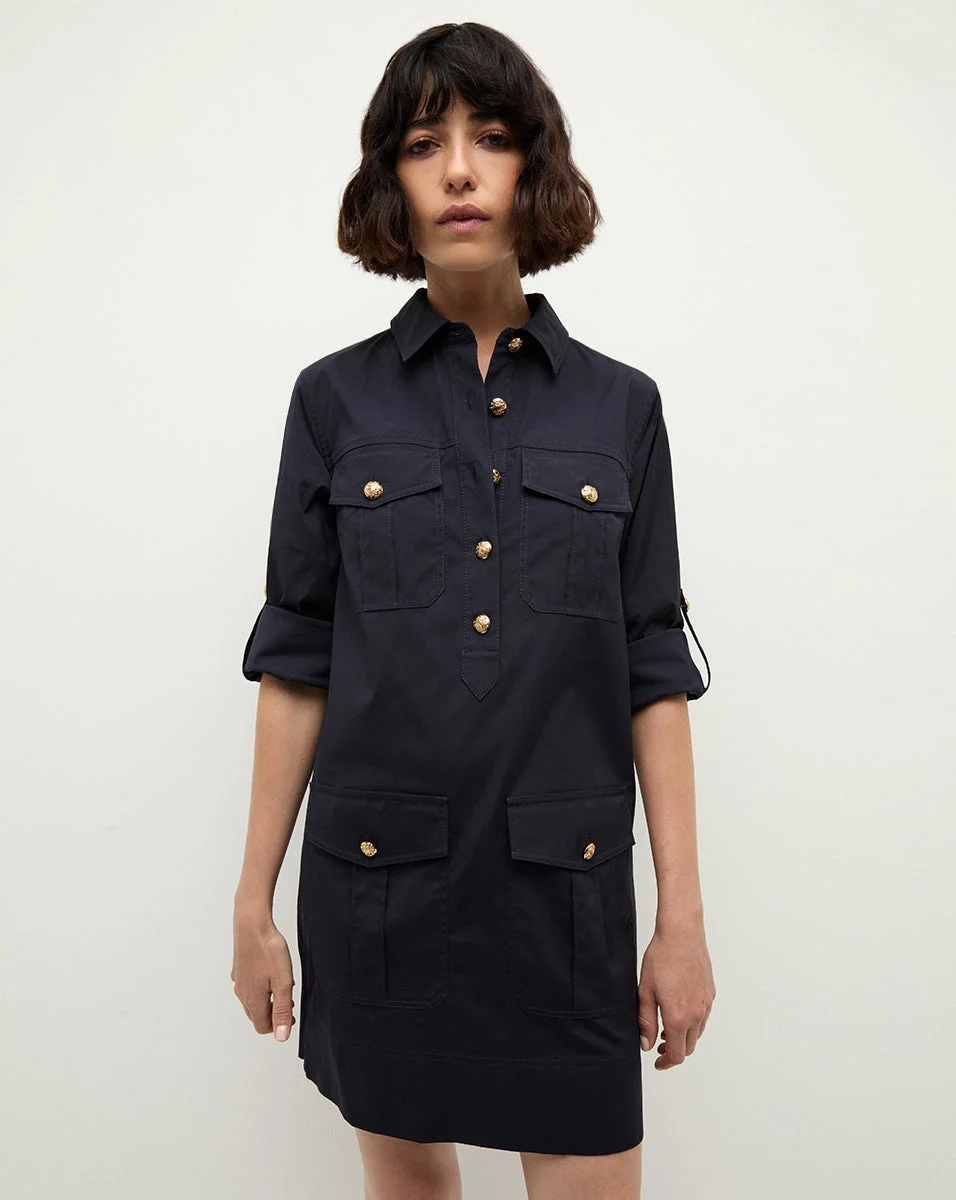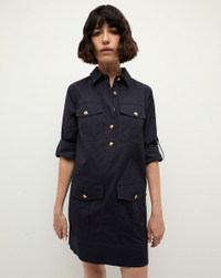 Product details Utilitarian ease. Cut from stretch-cotton poplin, our Saude dress has a relaxed fit and a throw-on-and-go appeal. It’s finished with a neat collar, button-down placket and 4 patch pockets. Inner tabs inside the sleeves allow for easy rolling. Now in white for summer, this shirtdress can take your to work, to date night and everywhere between. - 97% Cotton, 3% Elastane - Professional dry clean only - Style #2402SCP21135