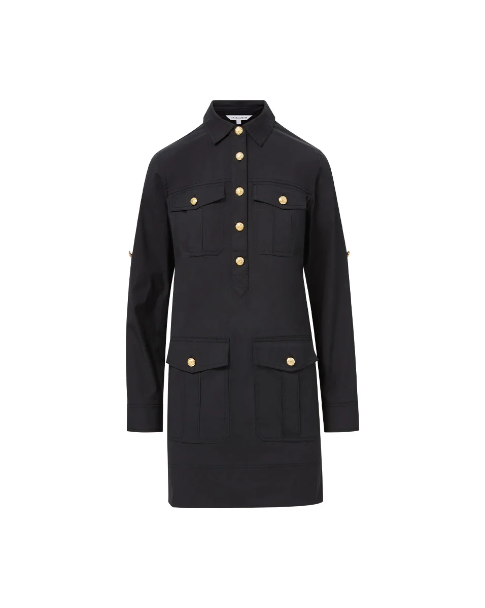 Utilitarian ease. Cut from stretch-cotton poplin, our Saude dress has a relaxed fit and a throw-on-and-go appeal. It’s finished with a neat collar, button-down placket and 4 patch pockets. Inner tabs inside the sleeves allow for easy rolling. In ultra-versatile black, this shirtdress can take your to work, to date night and everywhere between. The Saude dress runs large, we recommend sizing down. DETAILS & FIT - 97% Cotton, 3% Elastane - Length 34.5”, based on a size 2 - Our model is 5'10" and is wearing a size 2 - Professional dry clean only - Style #2402SCP21135