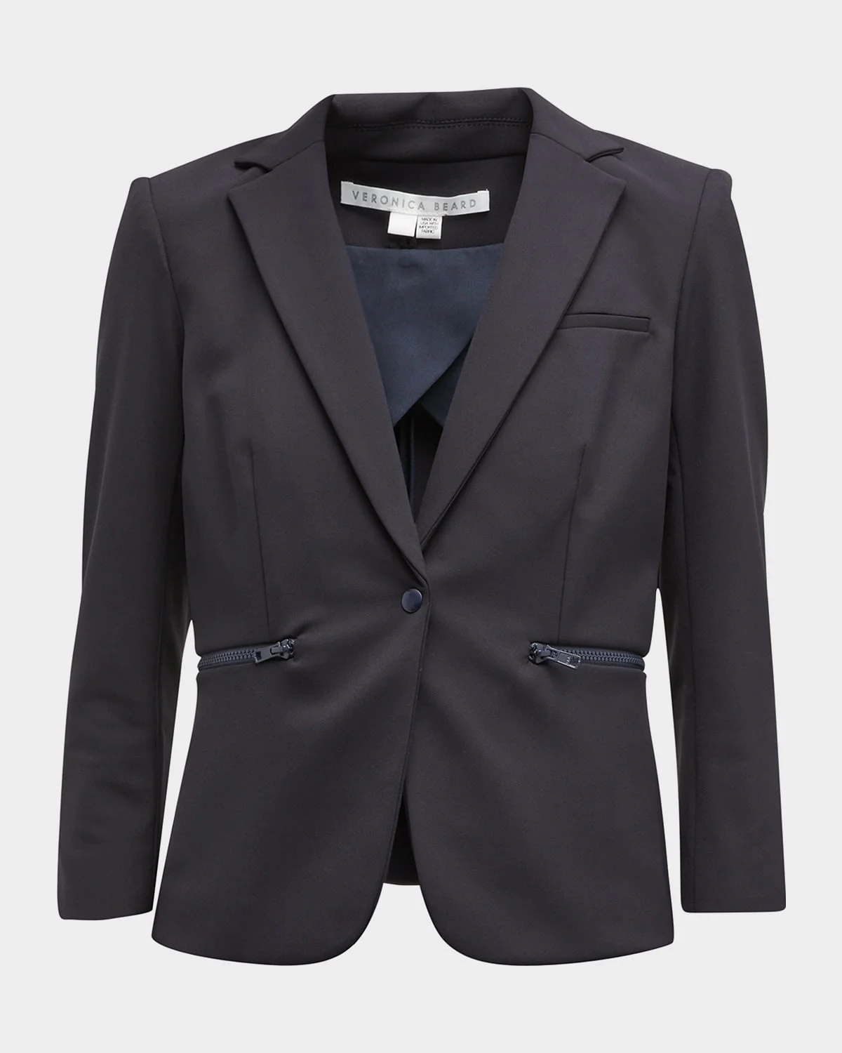 Veronica Beard "Scuba Schoolboy" blazer Approx. 23.3"L down center back. Notched collar; onesnap front. Threequarter sleeves. Zip and welt pockets Tailored fit Cutaway hem Nylon/spandex. Dry clean. Made in USA of imported material.