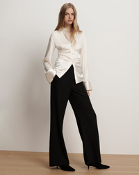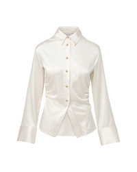Product details A luxe take on the classic button-down. Crafted from ivory stretch-silk satin, the Shiona collared blouse features a slim, body-skimming silhouette with side ruching for a waist-defining fit. An angled hem, flared sleeves with exaggerated cuffs, and gold-toned dome buttons complete the look. Pair with classic blue jeans to elevate the everyday. - 53% Silk, 35% Viscose, 12% Elastane - Dry clean only - Style #2511FL5041452