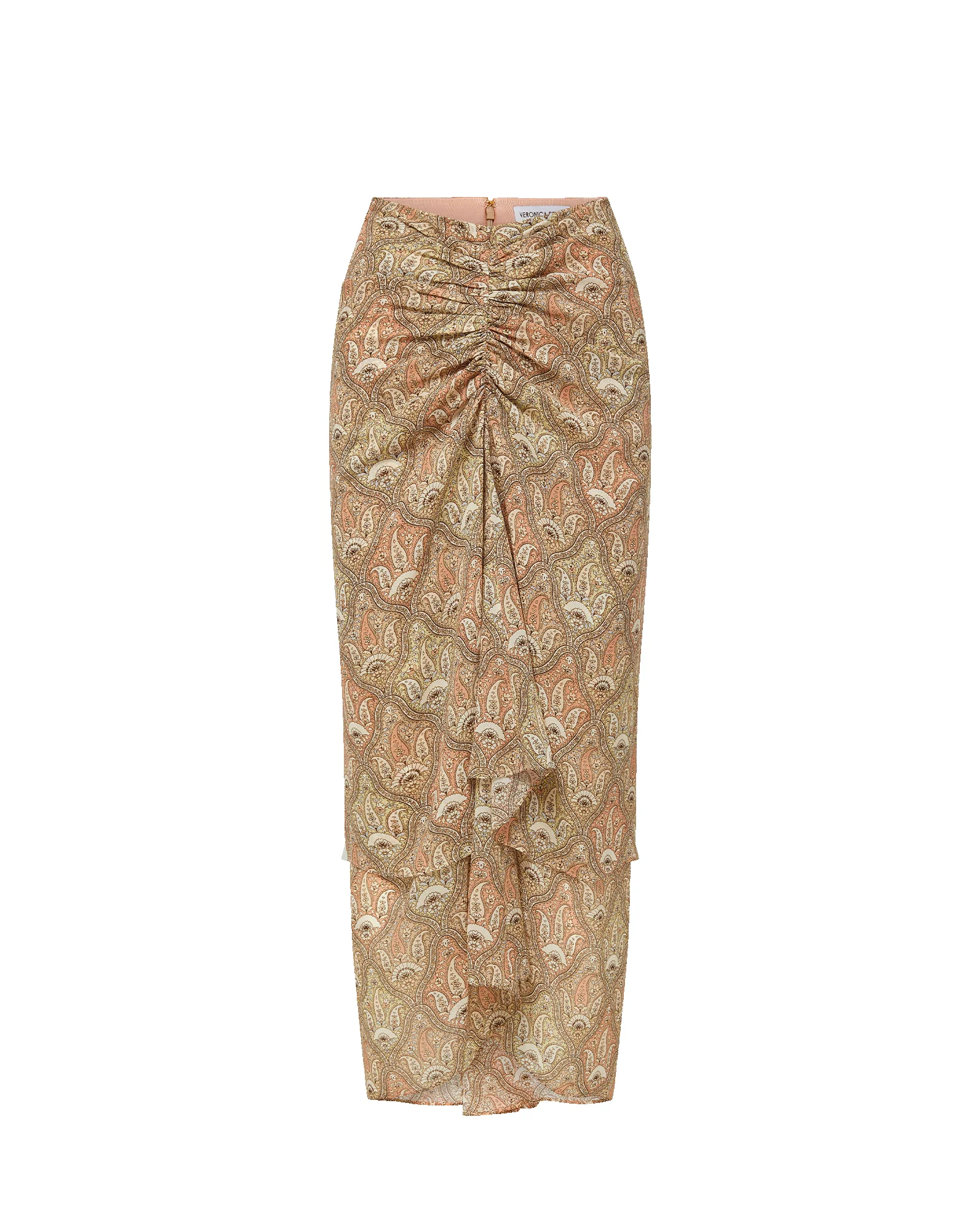 Product details Crafted from airy silk georgette, the Sira midi skirt is a versatile warm-weather staple. Printed with a custom paisley pattern in soft beige and pink hues, it features ruching at the center of the waist for flattering shape, while its tiered silhouette and handkerchief hem create natural movement. Style with a tank and sandals for off-duty moments, then dress it up with a belt and heels. - 100% Silk - Lining: 93% Polyester, 3% Elastane - Dry clean only - Style #2604GG7530264