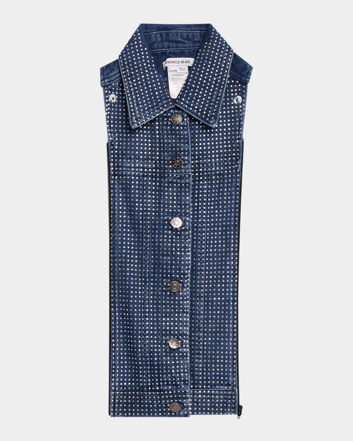Veronica Beard "Slate" denim dickey embellished with shimmering rhinestones & nbsp; Approx. length: 20" from shoulder to hem Interchangeable with any Veronica Beard dickey jacket (sold separately) Spread collar Button-front & nbsp; Cotton Dry clean Imported SIZE & FITModel measurements: 5 & apos;10" tallModel is wearing a US size 4/Small