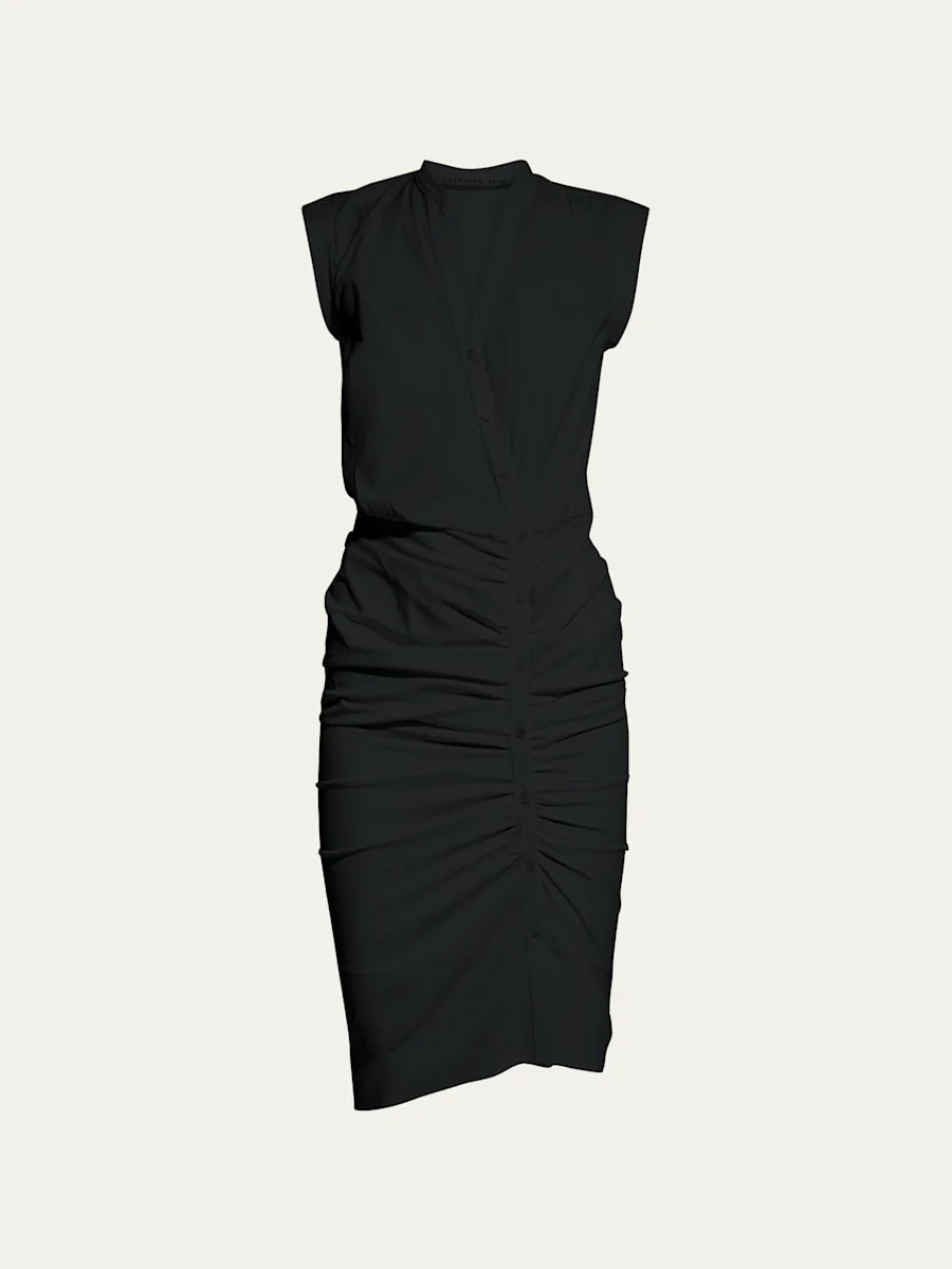 Veronica Beard poplin shirtdress in stripes. Approx. 46"L from shoulder to hem. Inverted collar; asymmetric button front. Sleeveless; extended shoulders. Sheath silhouette. Ruched through skirt. Arched hem hits knee. Cotton/spandex; dry clean. Imported. Online Inquiries: BGS21_TTYVN| Store Inquiries: #2081472