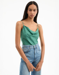 Product details Expertly crafted from premium stretch silk, the Sola tank top in vibrant green will be a versatile addition to your wardrobe. The minimalist style features a draped neckline, an effortless fit, and a subtle tonal chain pattern. Layer under a pantsuit for work or pair with jeans and heels as a going-out top. - 74% Viscose, 26% Silk - Unlined - Dry clean only - Style #2505JQ1640531