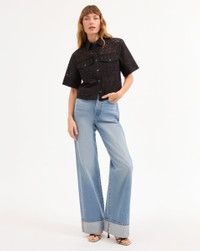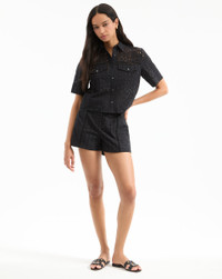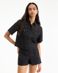 Product details An elevated take on the summer shirt. Expertly tailored from lightweight cotton, the black Spruce top boasts a charming allover eyelet design. A warm-weather wardrobe hero, it's tailored for a cropped, boxy fit with wide half-sleeves for an effortless look and feel. Double front flap pockets add a utilitarian feel. Pair with jeans or the matching Fabian shorts for a dose of casual cool. - Lining: 100% Cotton - Dry clean only - Style #2504EM7841232