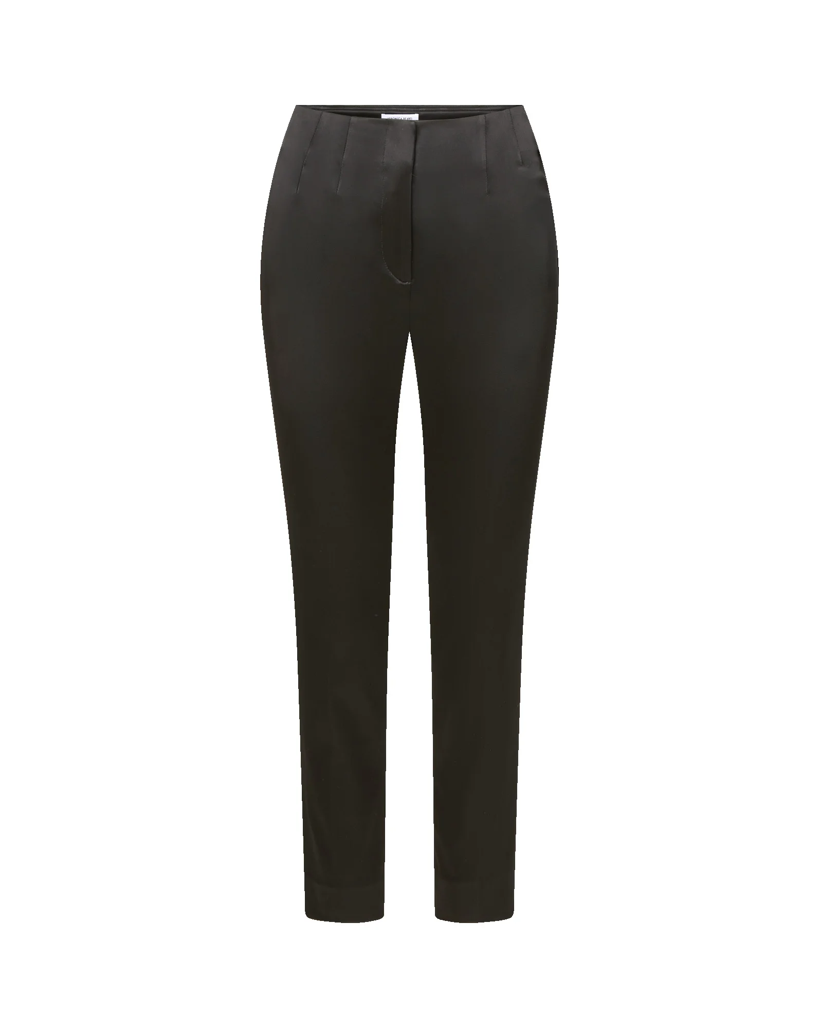 Product details A sleek dress pant with versatility. Expertly tailored in the USA from premium Italian satin, the Stila's high-rise Hollywood waistband defines, while its slim, straight leg elongates—cropped at the hem to show off your shoes. Welt pockets and a concealed hook-and-bar closure create a clean, streamlined finish. Pair this black trouser with an oversized shirt or sweater to elevate the everyday—or with the coordinating Cynthia satin jacket for a chic tailored set. - 48% Acetate, 45% Polyamide, 7% Elastane - Lining: 96% Polyester, 4% Elastane - Made in USA - Fabric country of origin: Italy - Dry clean only - Style #2510NV00960330