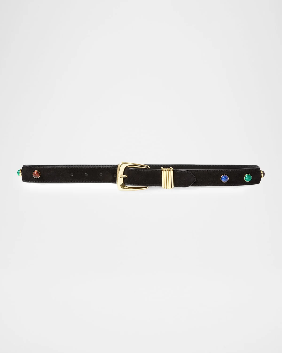 This Veronica Beard suede belt adds a touch of boho chic to any look, decorated with bezelset stones and bright goldtone hardware Approx. 31"L Adjustable length Thorn buckle Leather/stone Professional cleaning recommended Imported