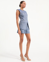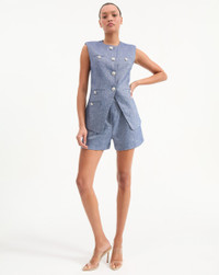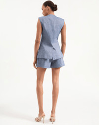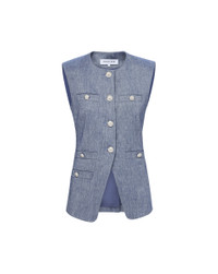 Product details A fashion-forward take on the vest. Expertly tailored from stretch Linen, the Tamara is defined by an angled cutaway hem and bold crest buttons. Finished with four welt pockets, the style is chic on its own or as a top layer. Pair this linen vest with blue melange pants for a high-impact matching set. - 53% Linen, 29% Polyester, 16% Viscose, 2% Elastane - Lining: 100% Polyester - Made in USA - Dry clean only - Style #CORESU2110446