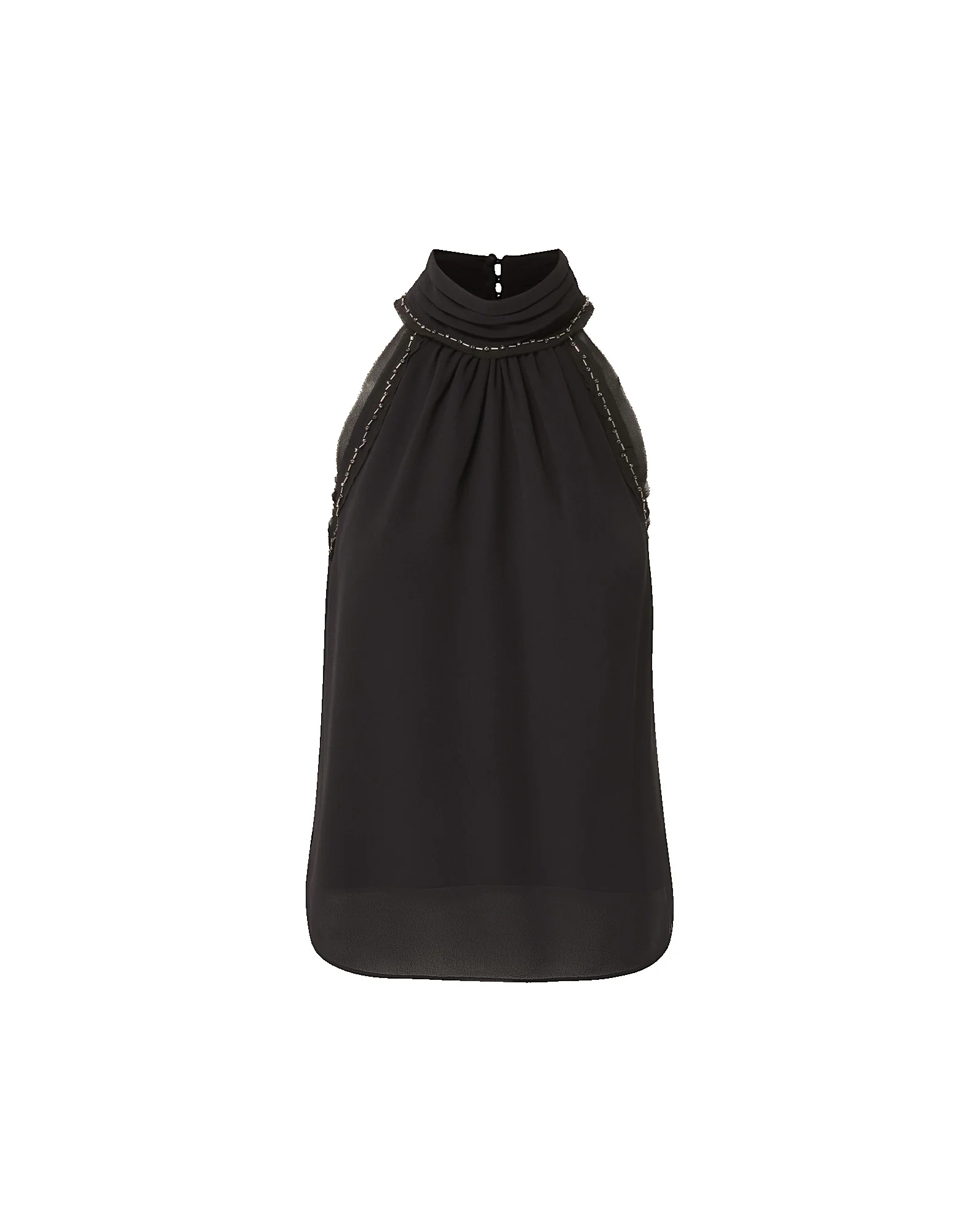 Product details Sleek, with subtle glamour. Crafted from luxe black silk, the Tanisha halter top features a delicately gathered neckline and soft, fluid drape. It’s finished with a sheer, raw hem with glass bugle bead trim and a back keyhole closure. Style it with a sweeping maxi skirt for evening elegance—or tuck it into jeans for a cool night-out look. - 100% Silk - Lining: 100% Polyester - Dry clean only - Style #2510GG6740713