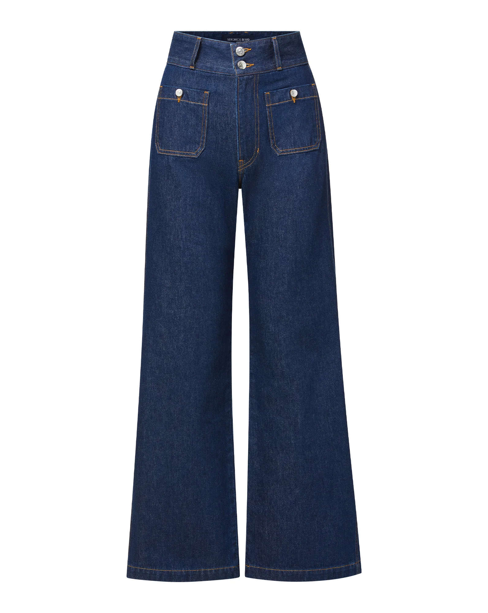 Product details The Taylor you know and love—now with front patch pockets and an extra-wide, double-button waistband for added definition. Everything else you love about the style remains the same, from the high-rise to the wide-leg silhouette. Made in LA from non-stretch Japanese denim in a dark indigo wash, this VB best-seller is a year-round must-have. - 100% Cotton - Made in LA from premium Japanese denim - Closure: Zip fly - Turn inside out and machine wash cold. Hang to dry. - Style #J25071681040ID