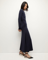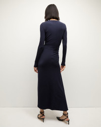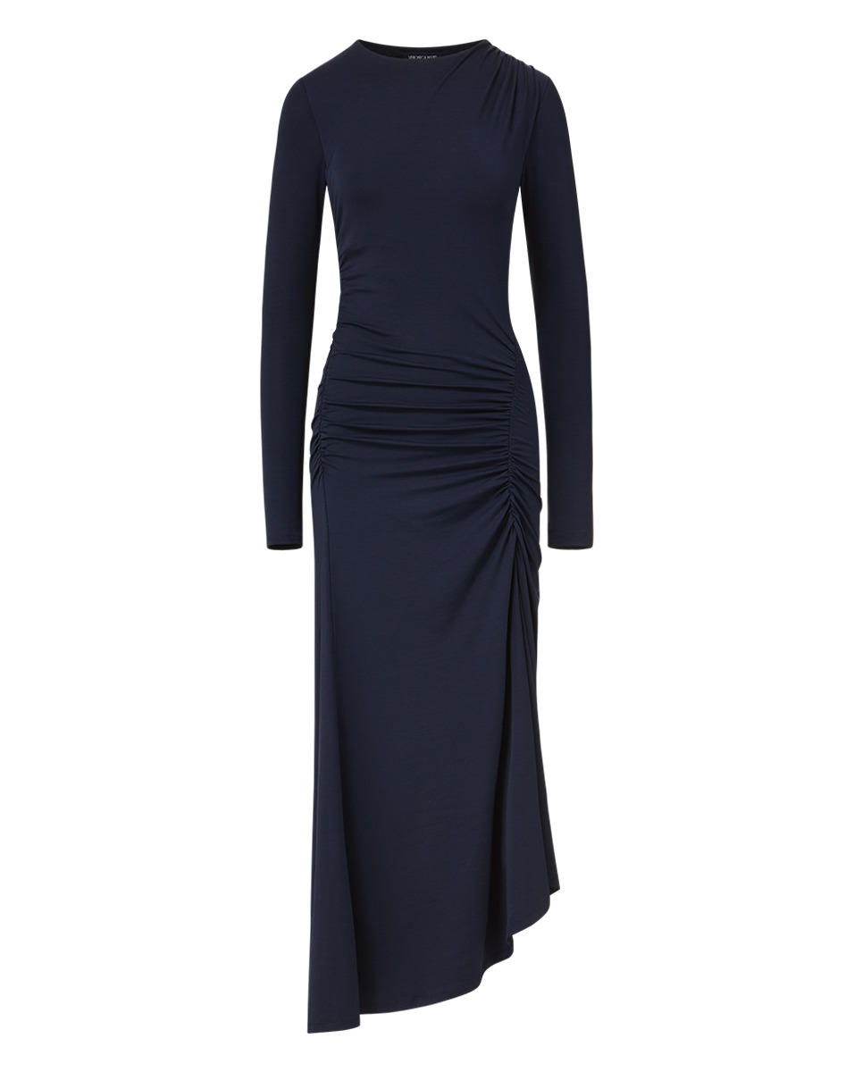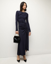 Product details A long-sleeve maxi dress with seductive appeal. The Theodora is an elegant Grecian silhouette, complete with draping and ruching down the sides and left shoulder. An asymmetrical hemline adds to the allure. Pair with strappy heels and statement jewelry. - 90% Lyocell, 10% Elastane - Unlined - Machine wash cold and tumble dry low - Style #J2409JY12421163