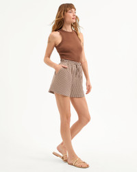 Product details The most effortless short you'll own this season. Crafted from an airy seersucker cotton blend in a brown gingham pattern, Tijana is cut for a relaxed, baggy fit and features an elasticated drawstring waist for ease. This versatile go-to can be styled with the coordinating Ilene button-down for a chic matching moment or paired with a simple tank for laid-back cool. - Details: 89% Cotton, 11% Polyester - Lining: 100% Cotton - Dry clean only - Style #J2504CO18180222