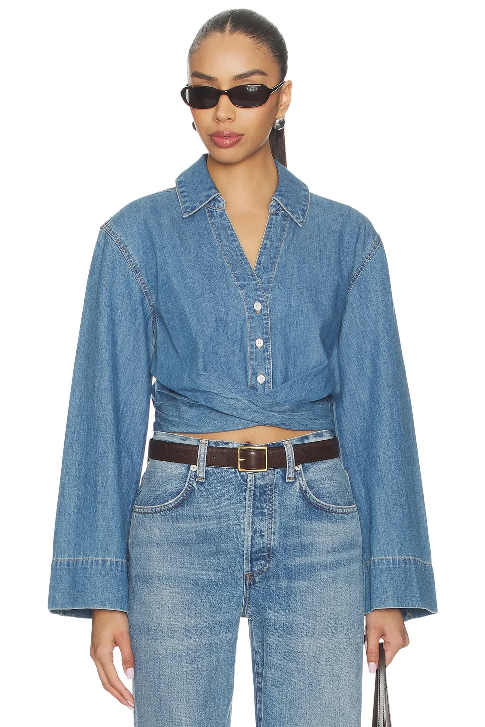 - 100% cotton - Made in China - Machine wash cold - Front button down closure - Elasticized backband - Lightweight denim fabric - Adjustable button cuffs - Revolve Style No. VBRD-WS266 - Manufacturer Style No. J26027100202RH