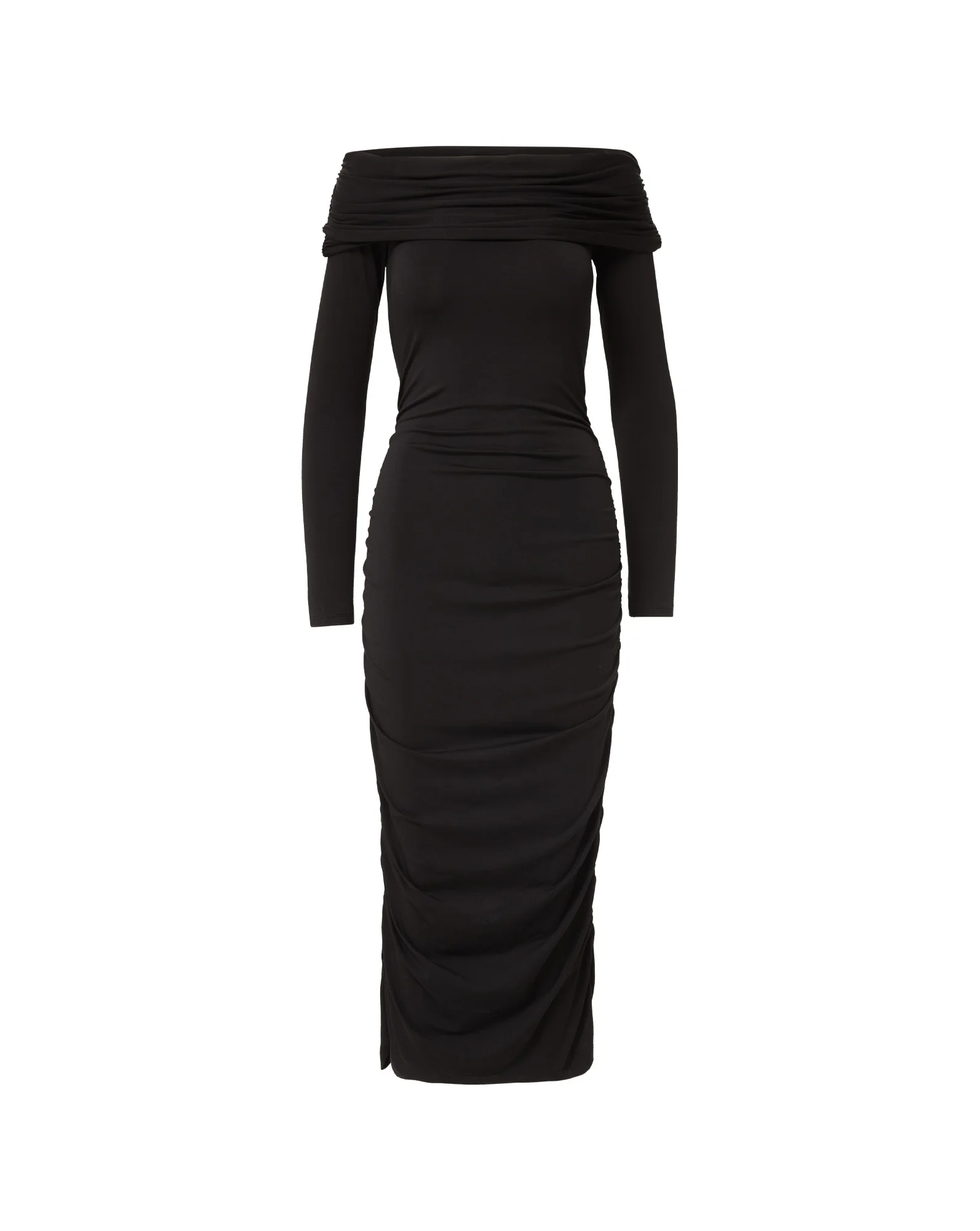 Product details Your go-to for date night. The Tinette long-sleeve midi dress is designed with a flattering bodycon silhouette and a flirty off-the-shoulder neckline. Ruching along the sides creates soft draping through the skirt, adding a feminine finish. Perfect for evenings out or event dressing, just add a strappy heel or boot to complete the look. - 90% Lyocell, 10% Elsatane - Turn inside out and machine wash cold. Lay flat to dry. - Style #J2509JY14721909