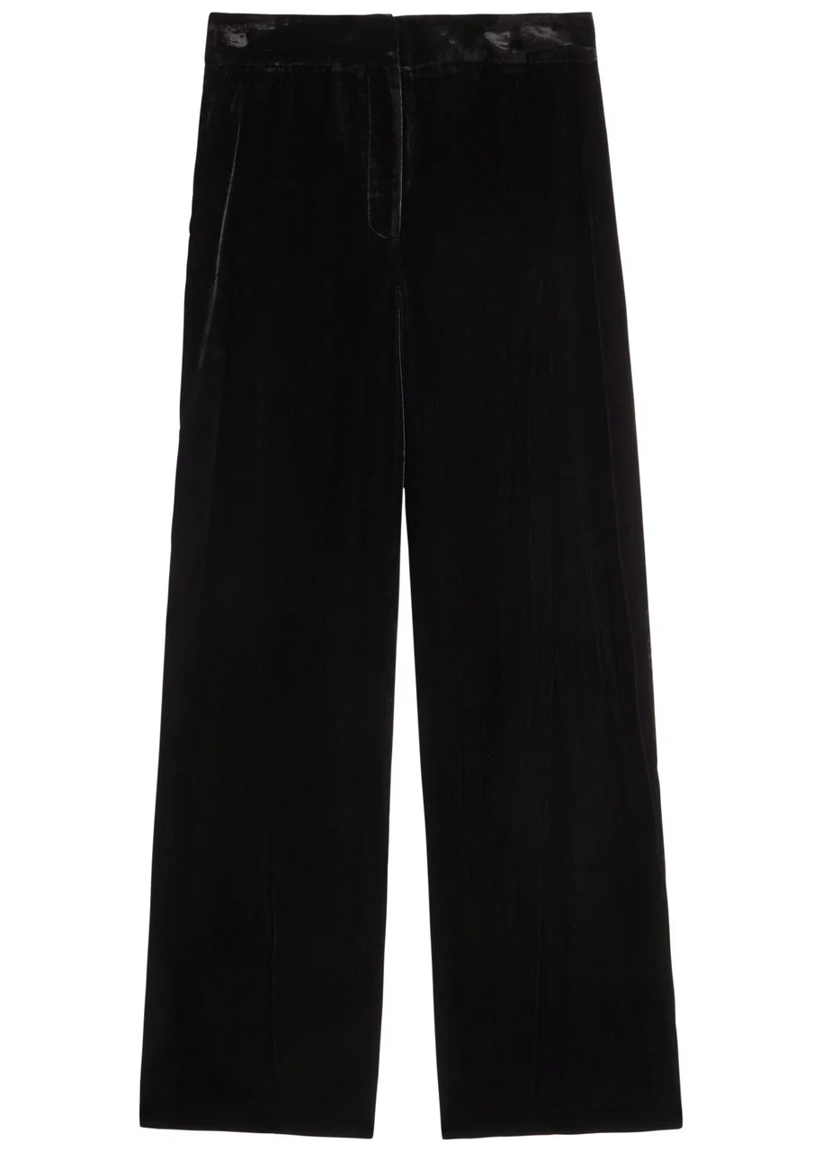 Info & Care Veronica Beard velour;trousers Back slit pockets, partially lined Concealed hook, button and zip fastening at front 75% rayon, 25% polyamide; lining: 96% polyester, 4% elastane; Dry clean Coordinating items available Size & Fit Inside leg length: 33 inches/ 84cm Midweight High-rise fit, wide-leg cut Model is 5'10"/ 178cm and wears a size;US4