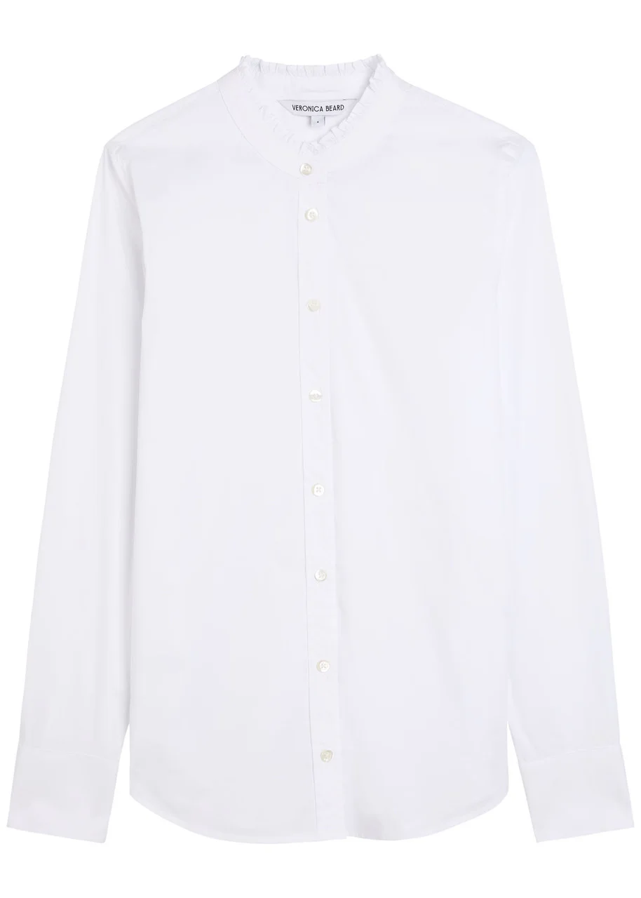 Info & Care Veronica Beard cotton-blend poplin;shirt Stand collar with frilled trim, adjustable button-fastening cuffs, box pleat at back, side splits at curved hem Button fastenings through front 67% cotton, 30% polyamide, 3% elastane Dry clean Size & Fit Length shoulder to hem: 25 inches/ 63.5cm Midweight Slim fit Model is 5'10"/ 178cm and wears a size;US4