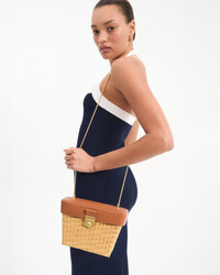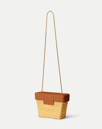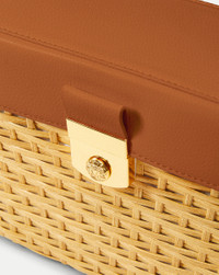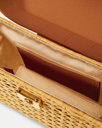 Product details Crafted from rattan and luxe leather, the Trap bag reimagines the classic wicker bag with our signature sculptural, trapezoid silhouette. A crest-lock closure and a gold snake chain complete the look while an interior slip pocket keeps cash and credit cards organized and secure. - 100% Rattan with leather details - Lining: Cotton twill - 6 3/10” L x 7 3/10” W x 3” H - Strap drop: 22” - Store in a cool, dry place and wipe any surface dirt with a dry cloth. To preserve the hand-painted finish, avoid water exposure. If wet, gently blot with a microfiber cloth. - Style #H2503HRT02X102