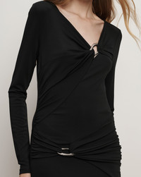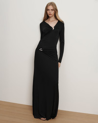 Product details Designed to turn heads. Crafted from black stretch jersey, the Viela maxi dress features a sleek, body-skimming silhouette with artful draping at the asymmetrical neckline and waist, punctuated by sculptural silver O-ring details. Equally cool and elegant, it's best finished with a simple, sky-high heel. - 95% Viscose, 5% Elastane - Unlined - Dry clean only - Style #2511JY19621985