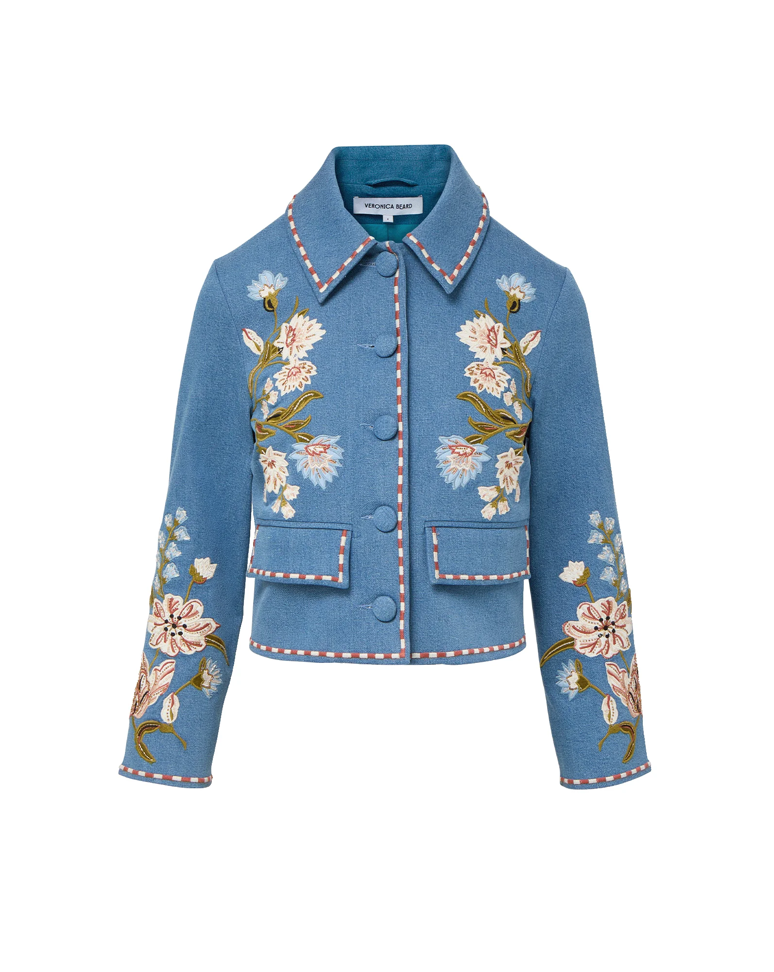 Product details The statement spring jacket. Expertly tailored from premium stretch denim in a medium blue wash, the Vikaria is defined by intricate floral embroidery and beading along sleeves, chest, and back, with a contrast red-and-white striped embroidered trim. Cut in a boxy, cropped silhouette, it’s finished with flap pockets, a pointed collar, and front placket with self-covered buttons. Style it with the matching mini skirt for standout set, or wear with classic jeans for an elevated daytime look. - 98% Cotton, 2% Elastane - Lining: 100% Polyester - Spot clean only - Style #2604EM10911956