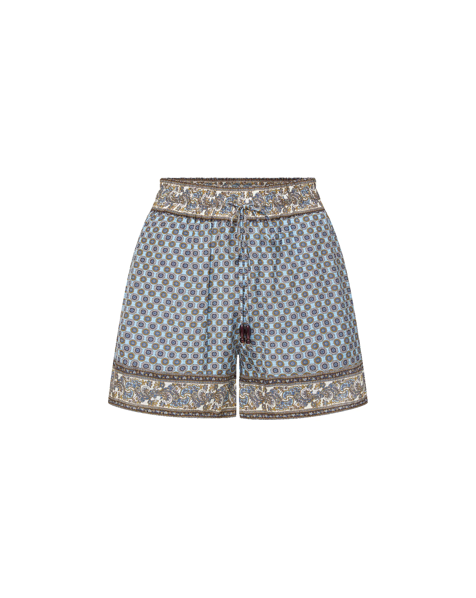 Product details Vacation mode on. Crafted from lightweight, breathable stretch cotton, the blue Vivaldi short is a relaxed weekend style. It features an elastic waistband, with a tasseled drawstring, and a graphic, scarf-inspired print. Made for beach days and beyond, it pairs with the coordinating Eva top for an effortless matching set. - 70% Viscose, 30% Cotton - Lining: 100% Cotton - Closure: Drawstring - Dry clean only - Style #2602VO2880477