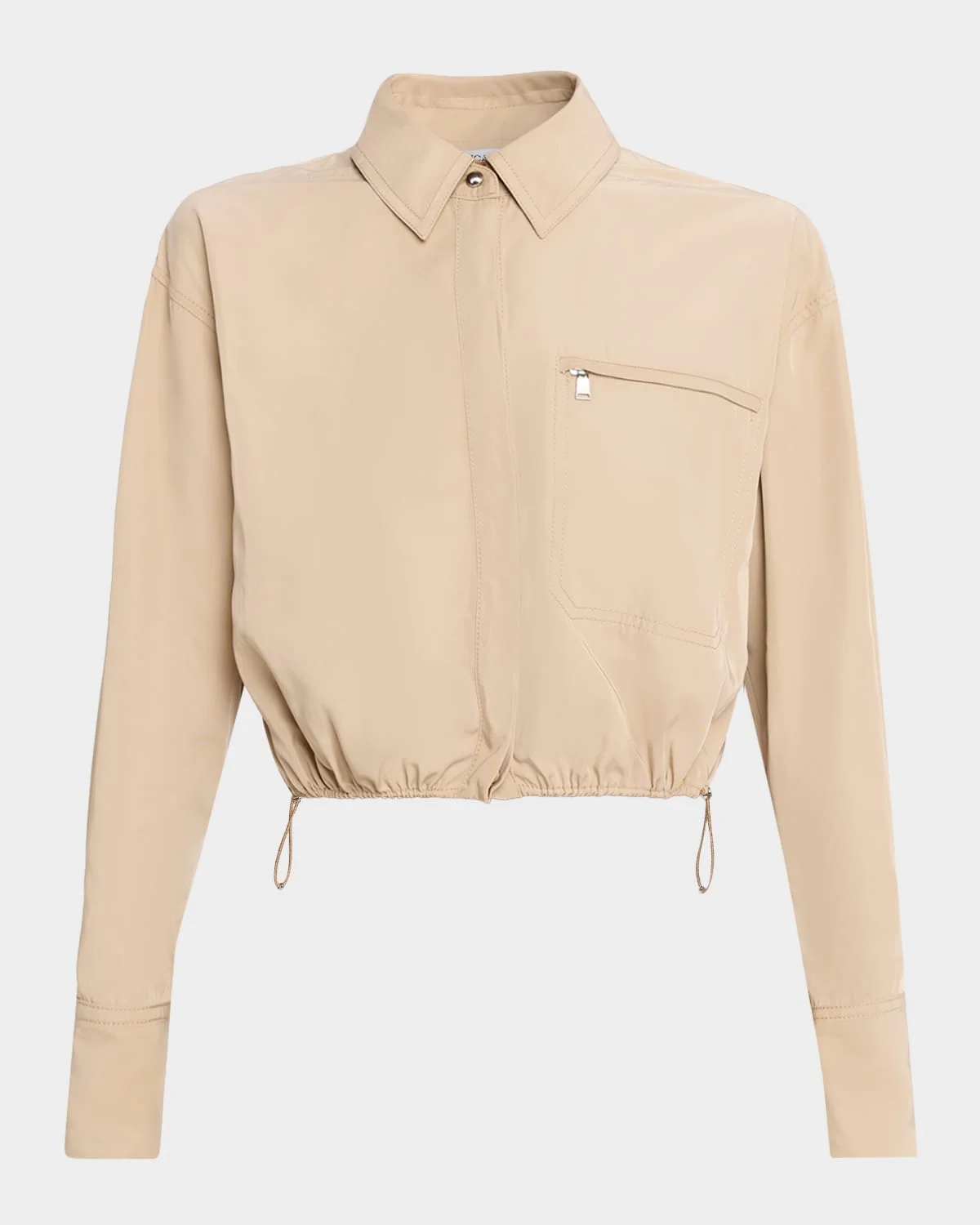 Crafted from soft, technical taffeta with a waterresistant finish, the "Wilfred" shirt by Veronica Beard features an adjustable bungee drawcord at the waistband for a cinchable shape Approx. 18.5"L from shoulder to hem Point collar; concealed button placket Long sleeve; approx. 32.3"L Oversized chest zip pocket Relaxed fit Slightly cropped length Polyester Unlined Dry clean Imported