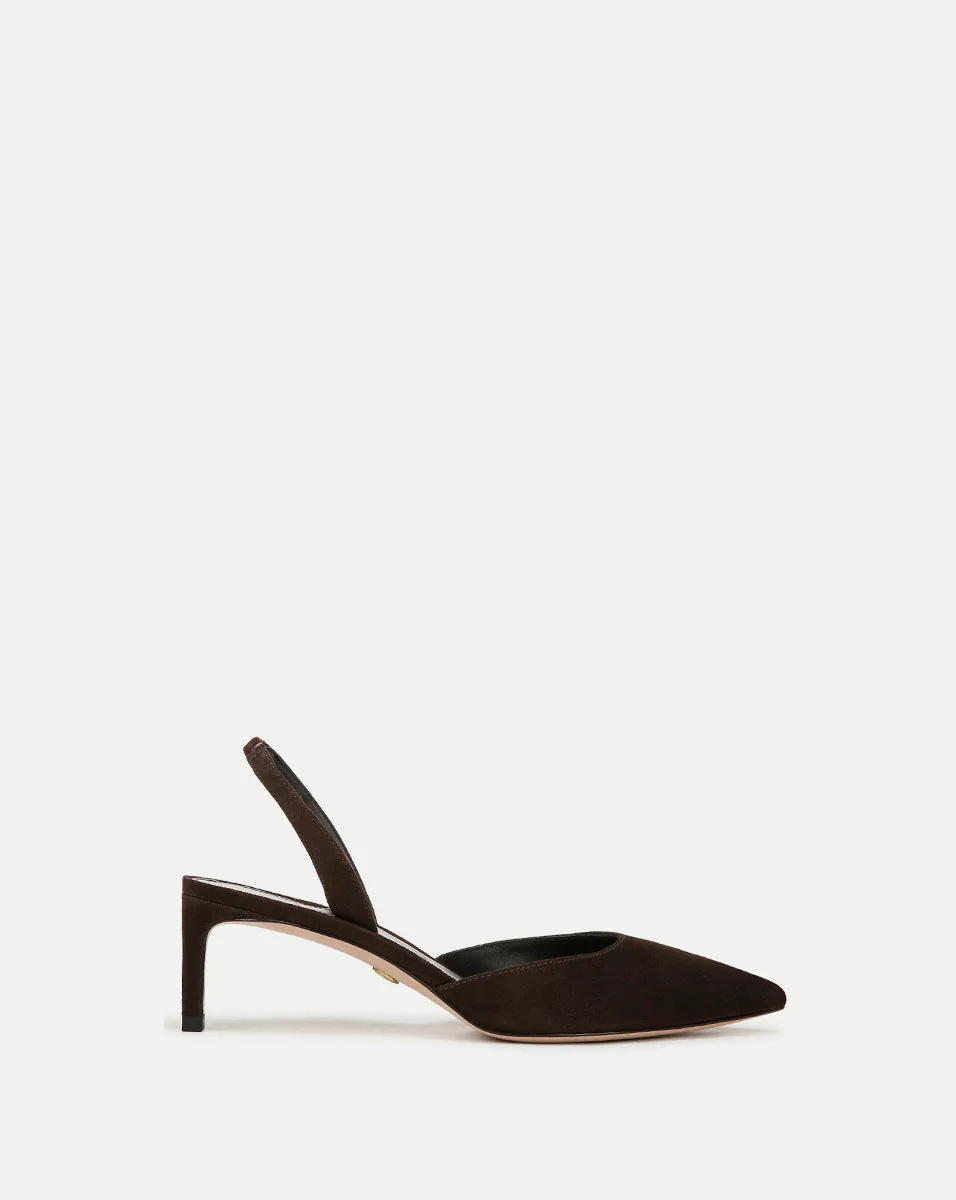 Product details A classic slingback pump. Expertly crafted from soft suede, this timeless style features a mid-heel, a pointy toe and an elasticized strap for comfort. These dark brown slingback kitten heels are great for both work and nights out. - Suede - 2" heel - Store in a cool dry place inside dust bag - Clean under the supervision of a specialist - Style #J2532L2201