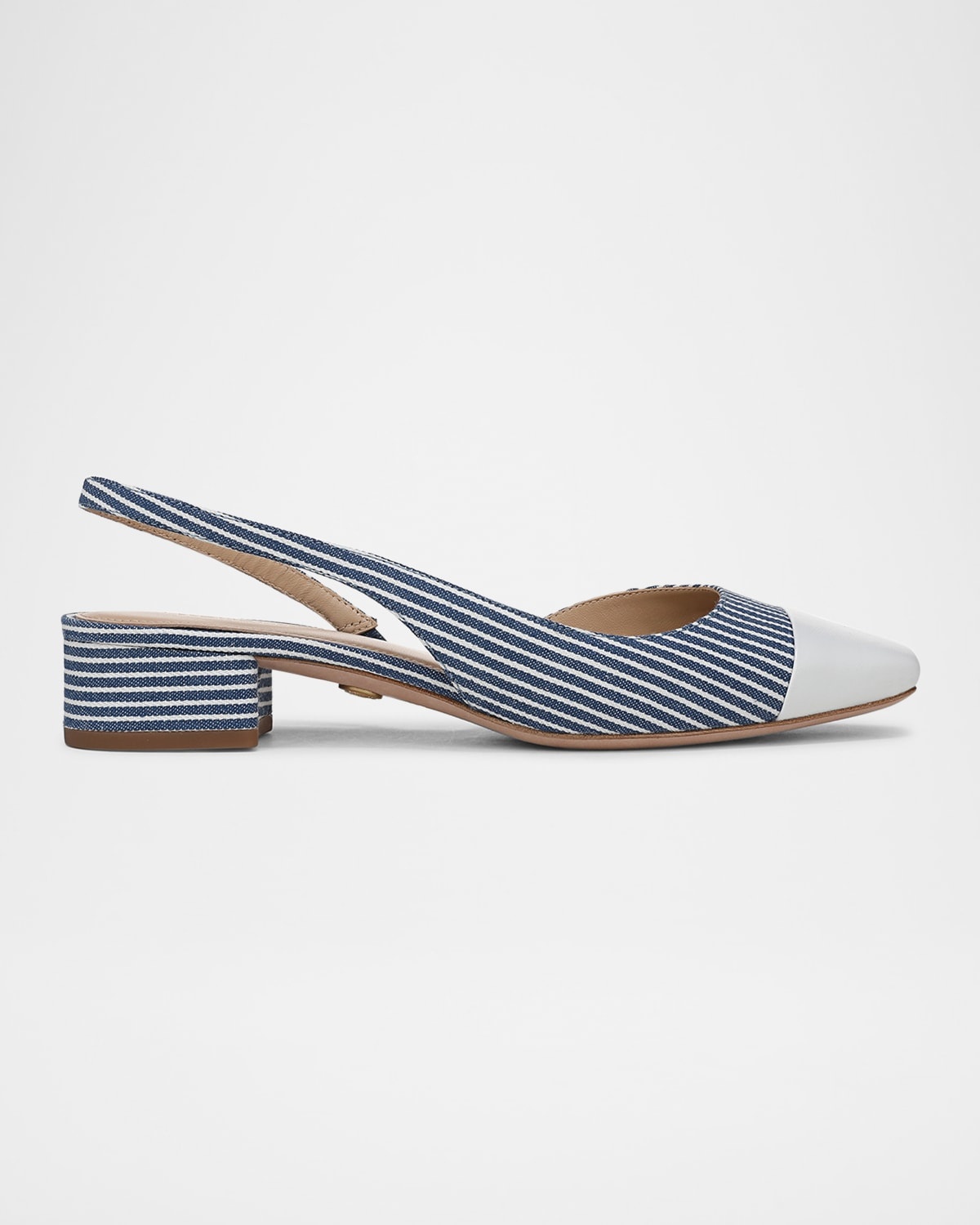 - Veronica Beard "Cecile" striped fabric and contrast leather ballerina pumps - 1.00 in / 25 mm block heel - Square cap toe - Asymmetrical slingback strap - Leather outsole - Lining: Leather - Professional cleaning recommended - Imported
