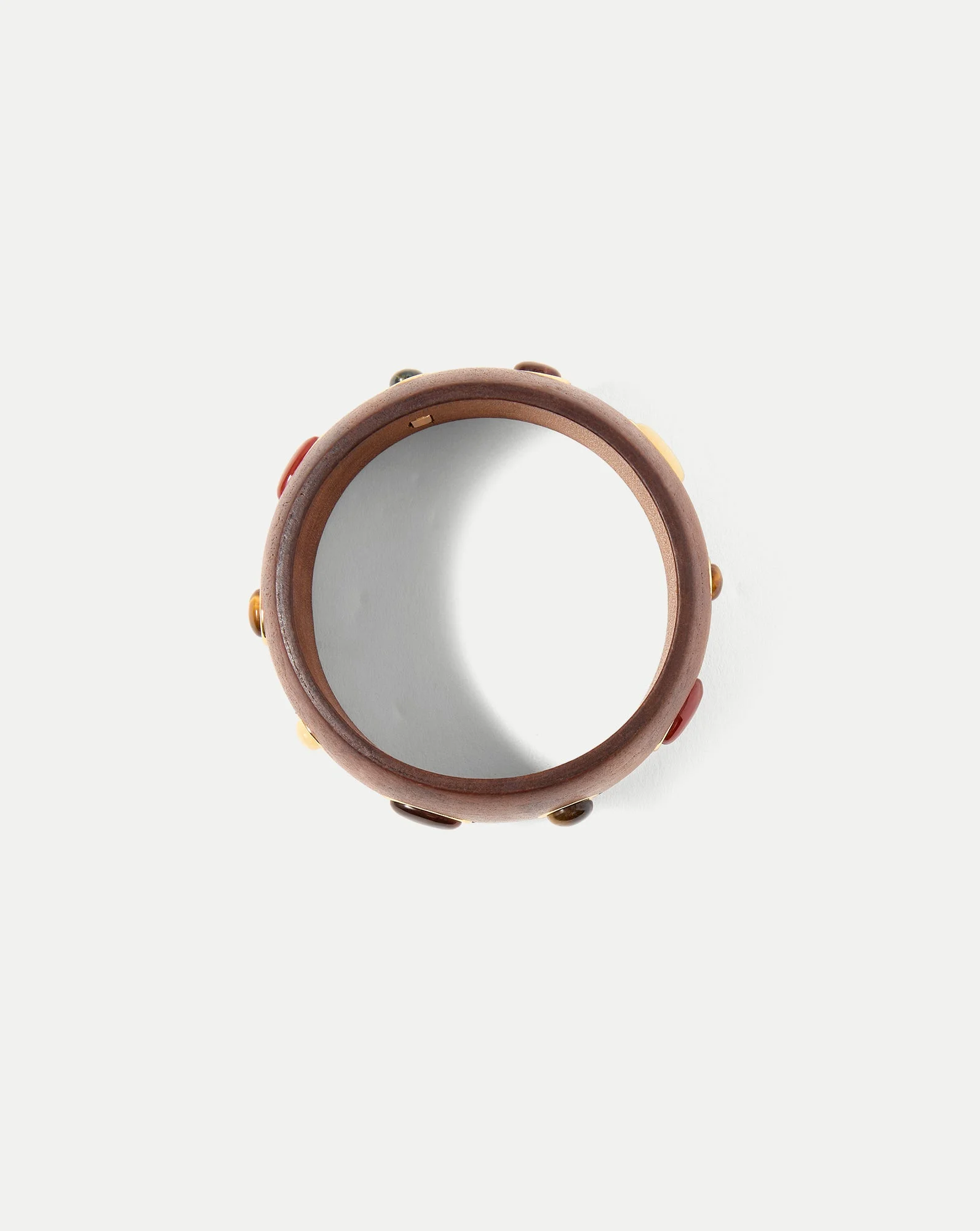 Product details The statement bangle, perfected. Crafted from natural wood, this chunky bracelet features multicolored cabochon embellishments, bezel-set in 12k gold-plated brass. Wear it solo or stacked with our resin bangles—it pairs effortlessly with a simple tee or layered over long sleeves. - Wood, 12k Gold-Plated Brass - Inner Diameter 63 mm - Gently wipe surface with a soft cloth to clean. Avoid direct contact with lotions, perfumes, or oils. - Style #96-B0004