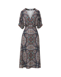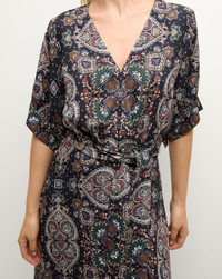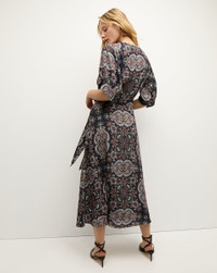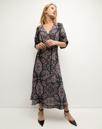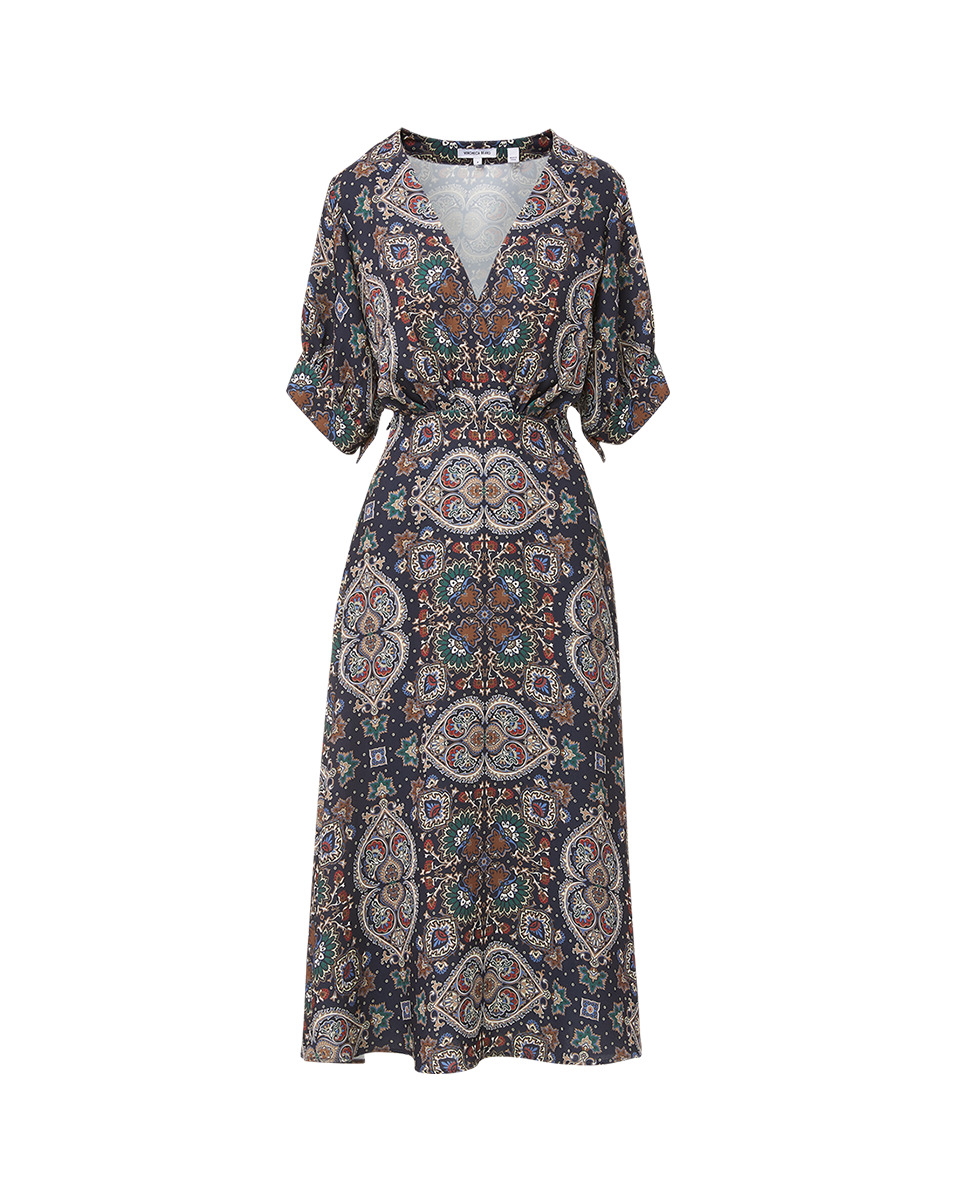 Product details An effortlessly chic midi, the V-neck Wyatt features a cinched-in waist and a kaleidoscopic bohemian print. Pair with sandals for day; switch to heels for date night. - 100% Polyester - Dry clean only - Style #2407CP4421054