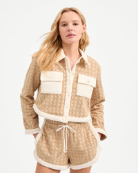 Product details The polish of a jacket, with the ease of a knit. Expertly spun from premium stretch cotton, the Zariah cardigan is a boxy, cropped silhouette with a textured tone-on-tone basketweave pattern. The contrast-color collar, chest pockets, and trim details offset the khaki color to bold effect. Pair with the matching Mulberry shorts for a chic summer set. - 80% Cotton, 20% Polyester - Turn inside out and machine wash on gentle cycle. Lay flat to dry. - Style #J2505JY175T0429