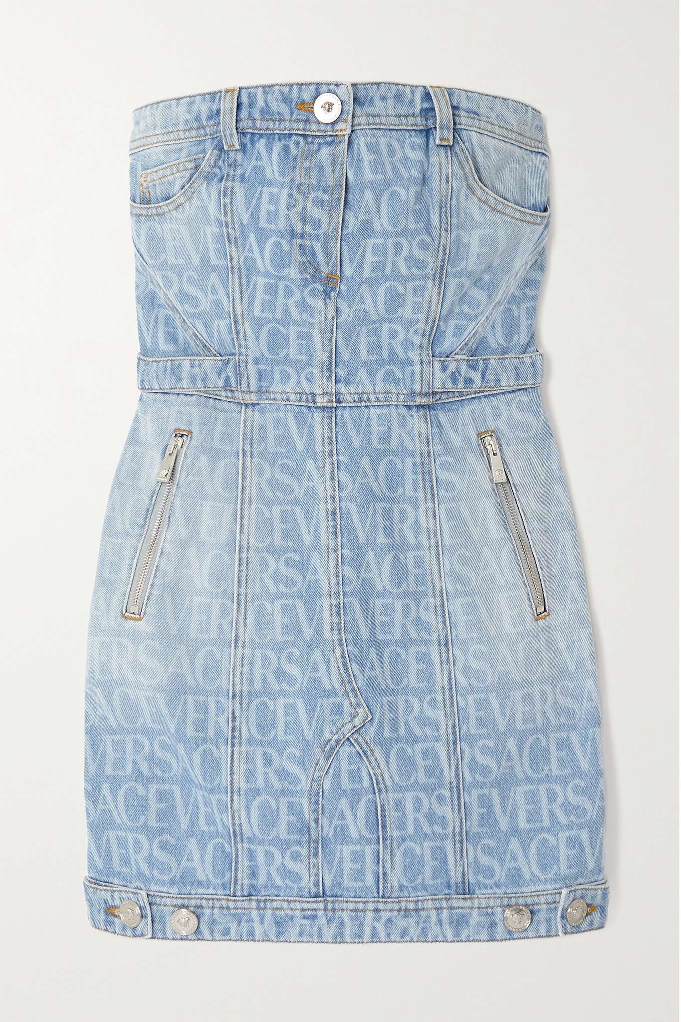 EDITORS'NOTES Logomania is in Versace's DNA - singer Dua Lipa wanted to call on the brand's big hits for her capsule collaboration. Patterned with the moniker, this dress is cut from faded blue denim for a close fit and features the kind of details you'd usually see on a pair of jeans. There's even a leather patch at the back. SIZE & FIT - Fits true to size, take your normal size - Designed for a slim fit - Mid-weight, non-stretchy fabric - Model is 177cm/ 5'10" and is wearing an IT 40 DETAILS & CARE - Tonal-blue denim - Zip fastening through back - 100% cotton - Machine wash